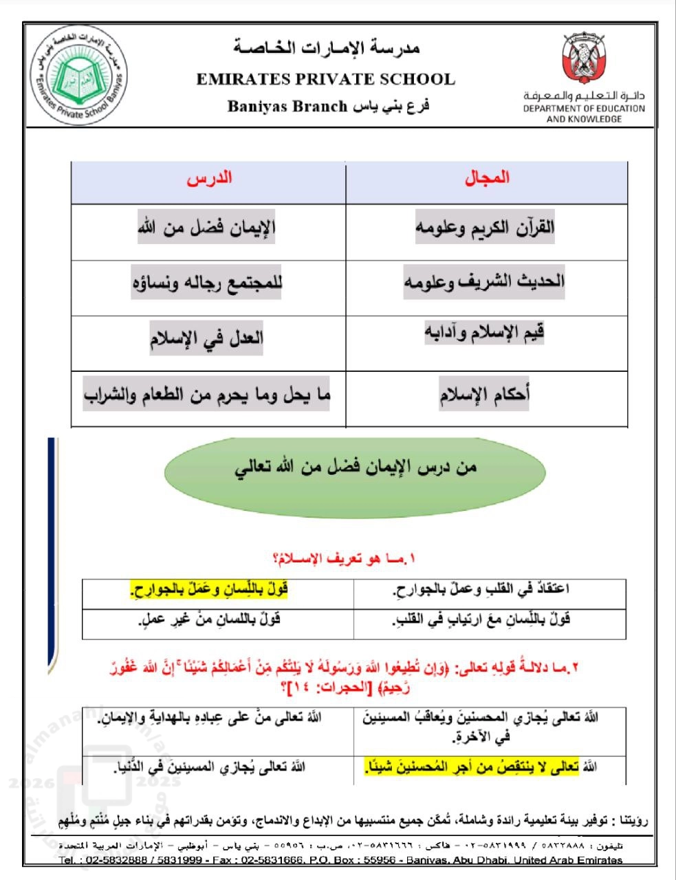 | حل مراجعة دروس الإيمان وللمجتمع رجاله ونساؤه والعدل ومايحل ومايحرم من الطعام والشراب - إعداد: مدرسة الإمارات الخاصة | ||