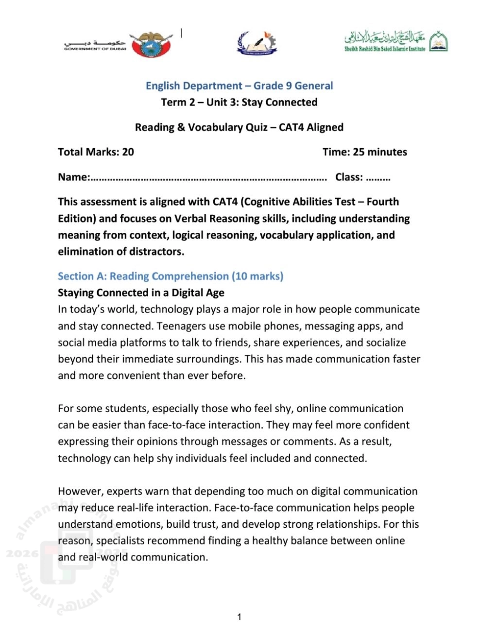 تم إيجاد الملف: أسئلة اختبار Vocabulary and Reading في الوحدة الثالثة Stay Connected المسار العام