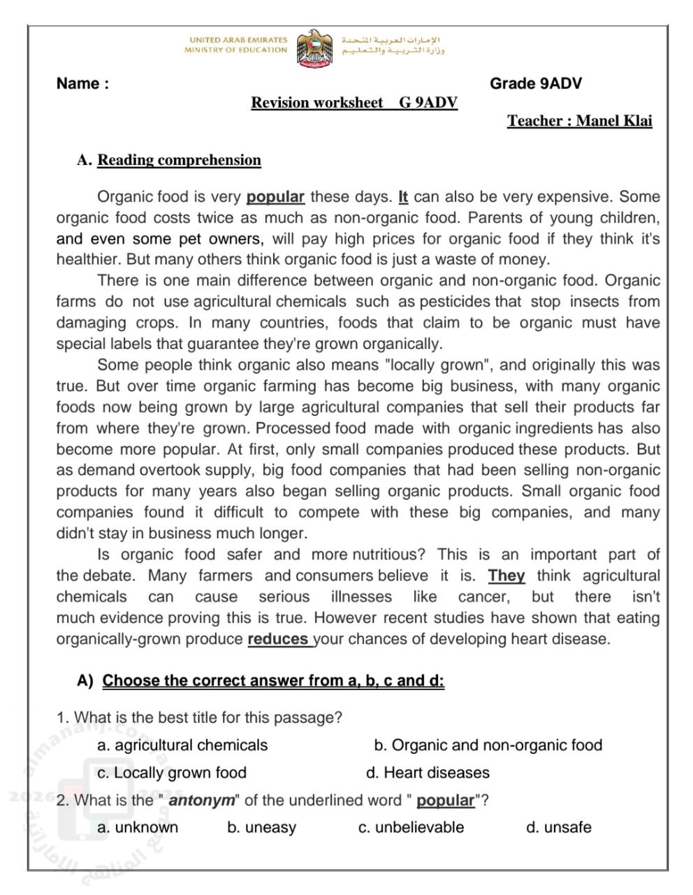 | أوراق عمل مراجعة Revision Worksheet فهم قرائي ومفردات المسار المتقدم - إعداد: Manel Klai | ||