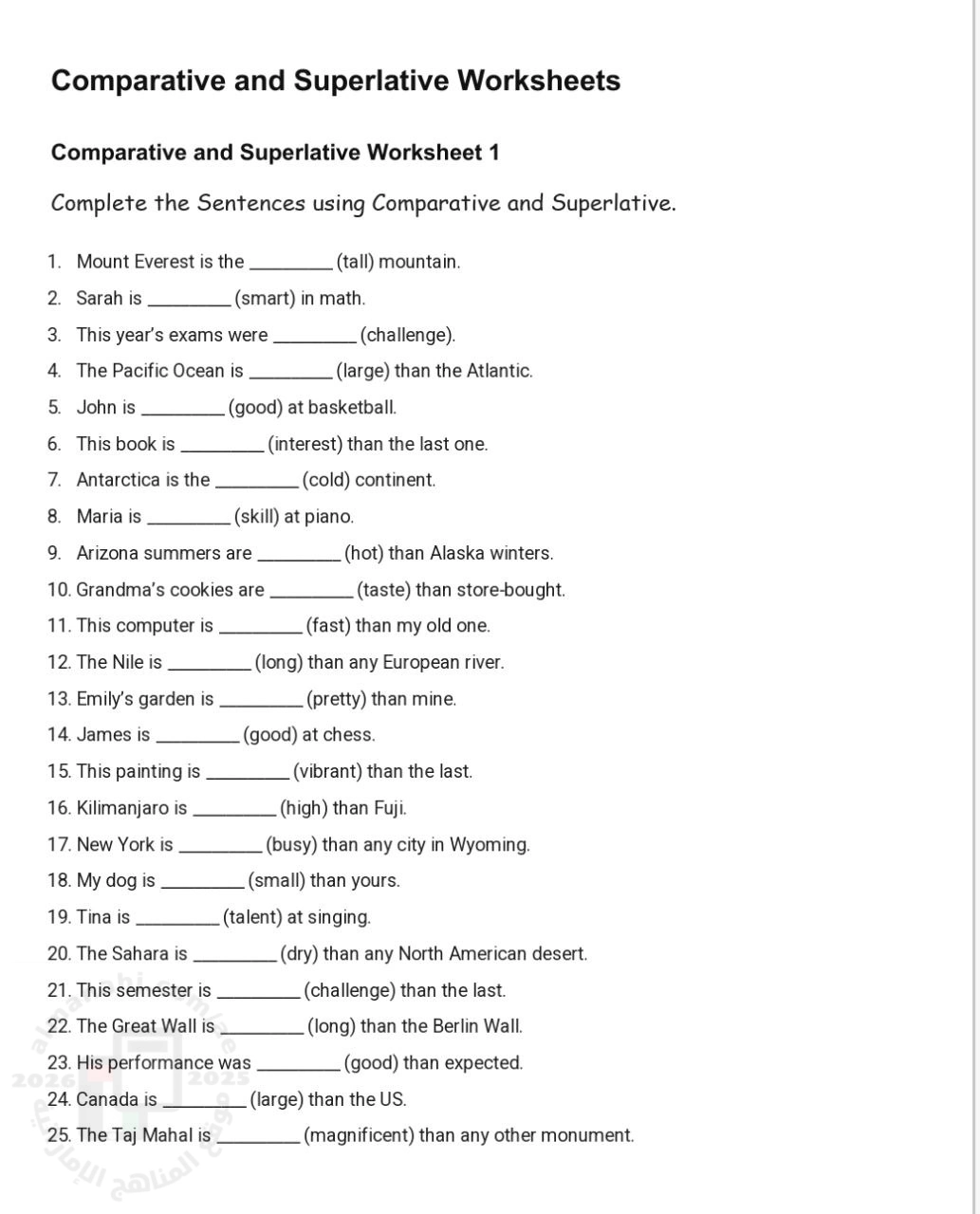 معلومات الملف: ملف "Comparative and Superlative Worksheets" – ملخص الملف عبارة عن أوراق عمل (تمارين) لتعليم المقارنة (Comparative) و التفضيل (Superlative) في اللغة الإنجليزية. الصفحة 1 و 3: أسئلة لإكمال الجمل بالشكل الصحيح للكلمة بين قوسين (إما المقارنة أو التفضيل). الصفحة 2 و 5: أسئلة اختيار من متعدد لاختيار الشكل الصحيح للمقارنة أو التفضيل لإكمال الجملة. الصفحة 4: جدول لتحويل الصفات إلى صيغ المقارنة والتفضيل. ملاحظات عامة: · الأسئلة تتركز حول قاعدة تكوين المقارنة (بإضافة er أو استخدام more) والتفضيل (بإضافة est أو استخدام most). | ||