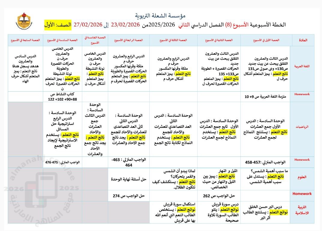 | الخطة الأسبوعية الأسبوع الثامن جميع الصفوف من مؤسسة الشعلة التربوية - إعداد: مدرسة الشعلة الخاصة | ||