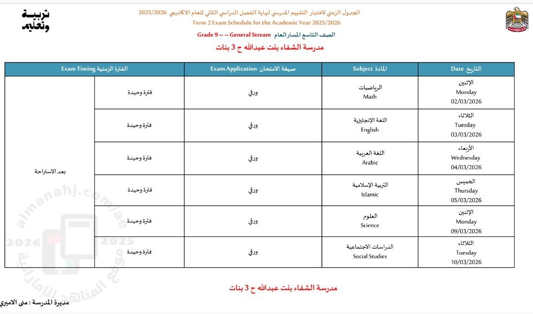 معلومات الملف: الجدول الزمني لاختبار التقيبم المدرسي نهاية الفصل الثاني للصفوف ( التاسع حتى الثاني عشر ) من مدرسة الشفاء بنت عبدالله - بنات و تبدأ الامتحانات يوم 2-3-2026 | ||