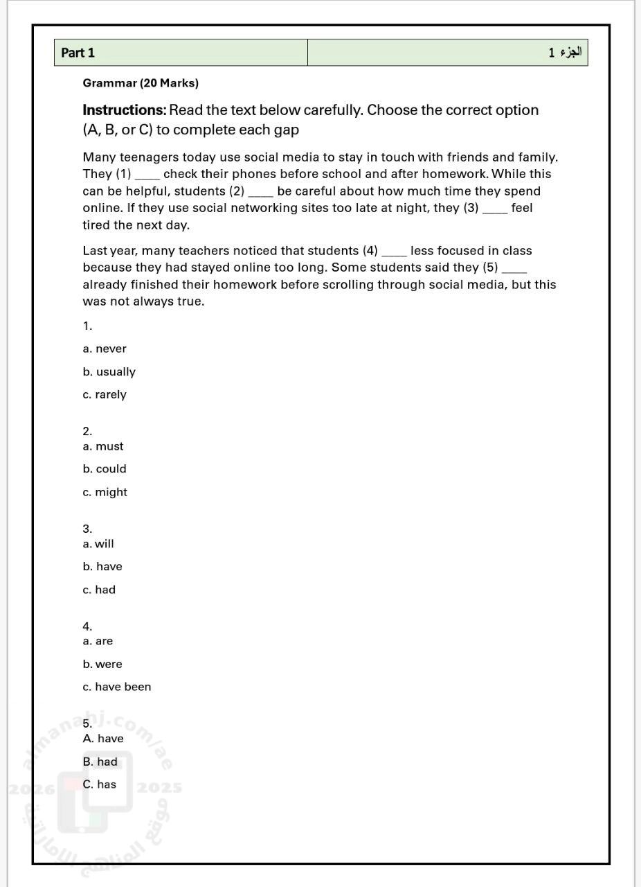 معلومات الملف: ملخص امتحان اللغة الإنجليزية للصف التاسع - الفصل الدراسي الثاني (النهائي) يتكون الامتحان من جزأين رئيسيين: القراءة (60 درجة) والكتابة (40 درجة)، بمجموع 100 درجة. القسم الأول: القراءة (60 درجة) 1. قواعد اللغة (20 درجة): يتضمن هذا الجزء نصًا قصيرًا عن استخدام المراهقين لوسائل التواصل الاجتماعي، وعلى الطالب اختيار الكلمة الصحيحة من بين ثلاثة خيارات (A, B, أو C) لملء 5 فراغات في النص. القسم الثاني: الكتابة (40 درجة) 1. المهمة الأولى - كتابة ملخص (15 درجة): يُطلب من الطالب قراءة نص بعنوان "التكنولوجيا في حالات الطوارئ" ثم كتابة الفكرة الرئيسية له في 3-4 جمل بأسلوبه الخاص. | ||