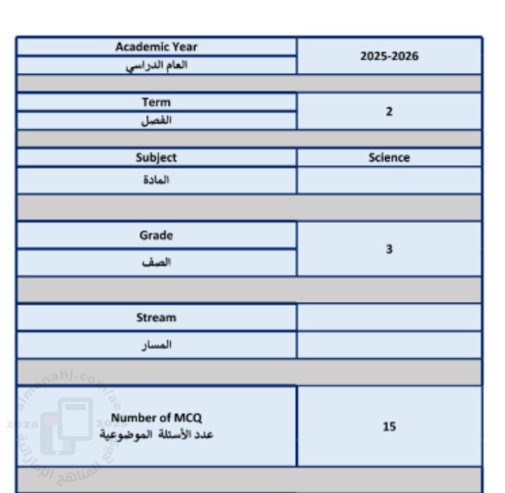 3. علوم, الفصل الثاني, 2025-2026, هيكل الامتحان النهائي للفصل الدراسي الثاني منهج انسباير Inspire