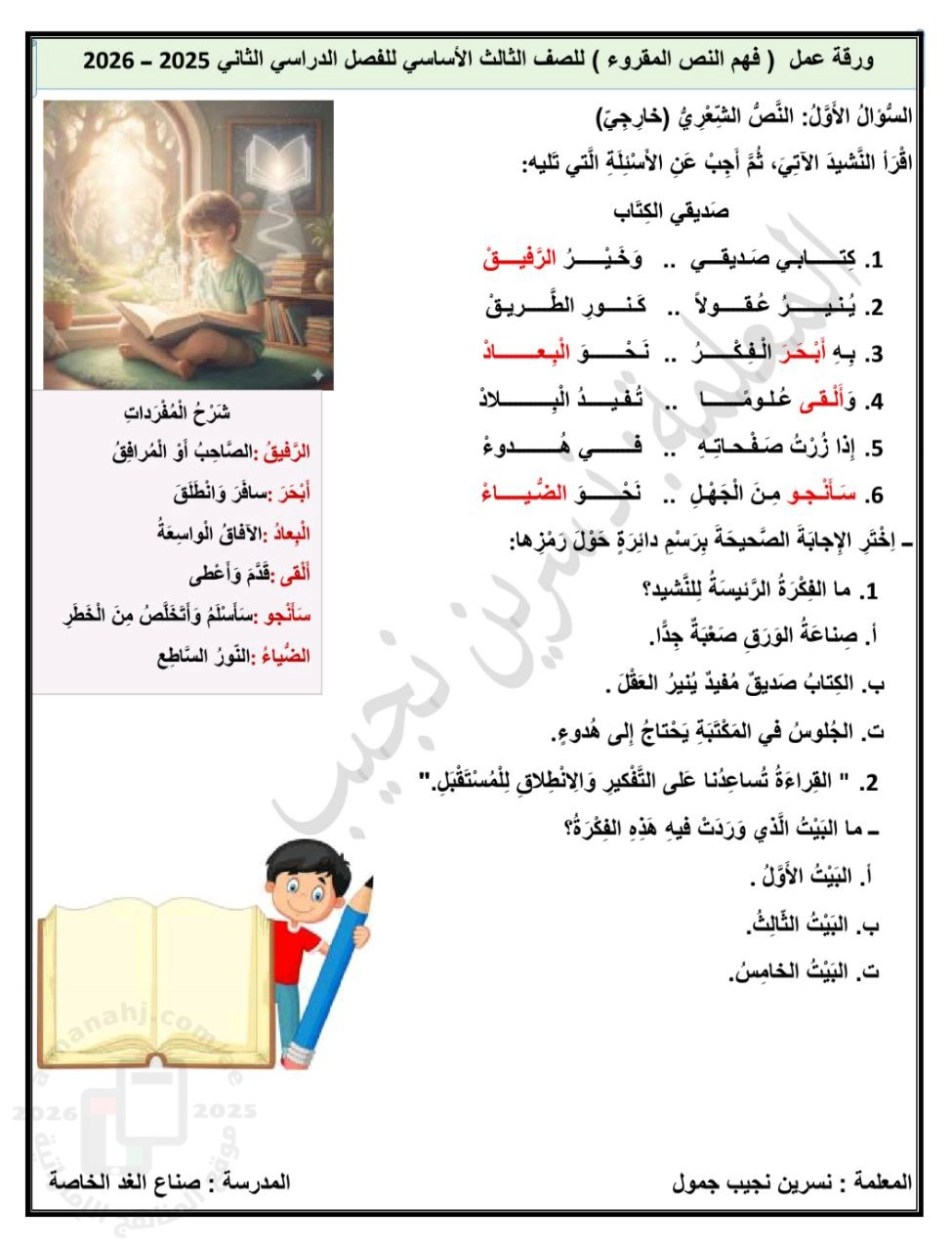 معلومات الملف: ورقة عمل تعزيزية فهم النص المقروء ( الشعري و المعلوماتي ) شرح للهيكل هذه الورقة تعزيزية في مادة اللغة العربية للصف الثالث الأساسي، الفصل الدراسي الثاني (2025-2026)، وتحت إشراف المعلمة نسرين نجيب جمول في مدرسة صناع الغد الخاصة. القسم الأول: النص الشعري (صديقي الكتاب) · النص: نشيد بعنوان "صديقي الكتاب" يصف الكتاب بأنه الصديق والرفيق الذي ينير العقول ويفتح آفاق المعرفة، والقراءة فيه تؤدي إلى النجاة من الجهل والوصول إلى النور. القسم الثاني: النص القصصي (قصة سُكْرَة) · النص: قصة عن سحابة صغيرة خجولة تُدعى "سُكْرَة" كانت تخاف من التحول إلى مطر والاختفاء. القسم الثالث: النص المعلوماتي (قوة المجموعة) · النص: نص نثري بعنوان "قوة المجموعة" يتحدث عن أهمية التعاون. الأنشطة الختامية · التعبير الكتابي: كتابة نص وصفي قصير (حوالي 5 أسطر) عن "مثلي الأعلى" (قدوة الكاتب)، مع الاستعانة بصور وإرشادات معطاة، وتوظيف مفردات وأدوات ربط مناسبة، ومراعاة قواعد النحو وعلامات الترقيم. | ||