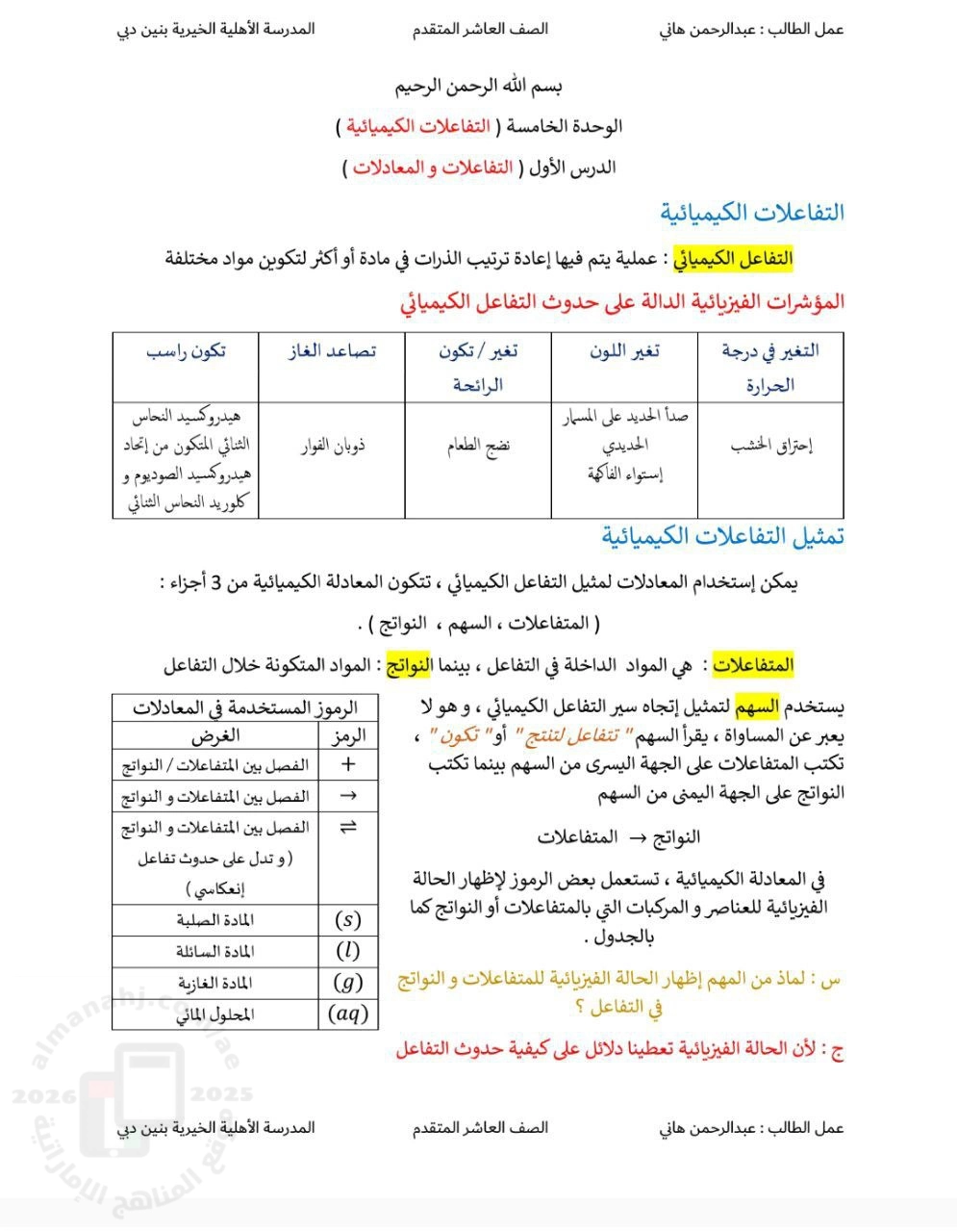 | ملخص شرح دروس وحدة التفاعلات الكيميائية ووحدة المول وفق الهيكل مع حل تدريبات - إعداد: الطالب عبد الرحمن هاني | ||