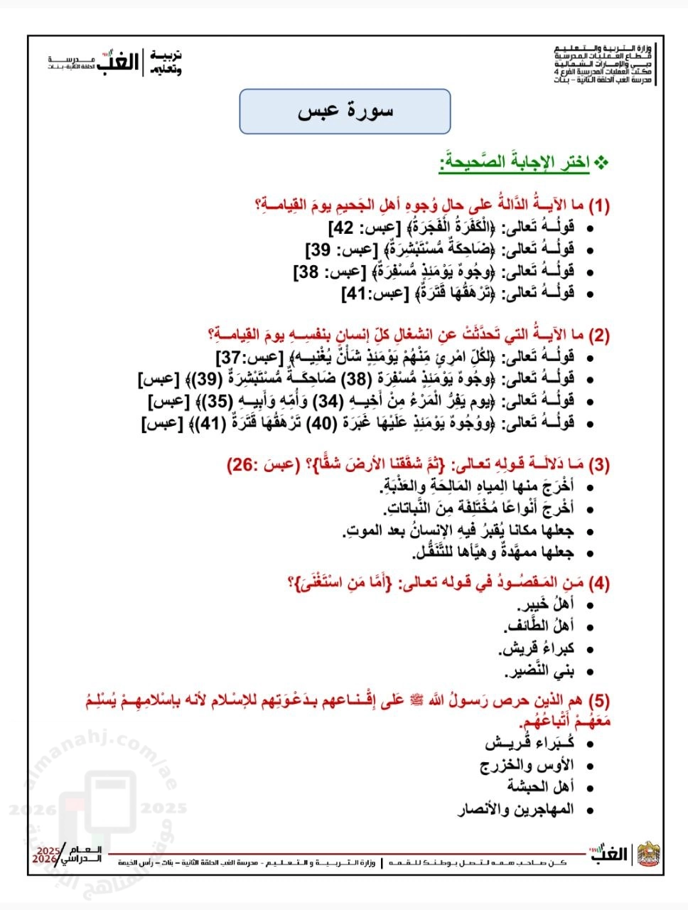 معلومات الملف: مذكرة اختيار من متعدد دروس الفصل ملخص عناوين دروس مذكرة التربية الإسلامية للصف الخامس - الفصل الثاني · سورة عبس وتفسيرها | ||