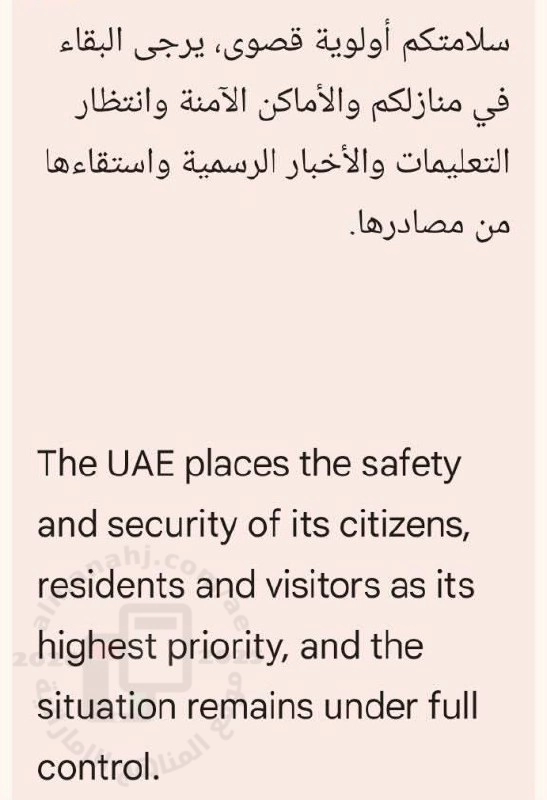 | أكدت الهيئة الوطنية لإدارة الطوارئ والأزمات والكوارث في رسائل نصية: "دولة الامارات تضع أمن وسلامة المواطنين والمقيمين والزوار كأولوية قصوى، ونطمئنكم أن الأوضاع مستقرة ومستتبة، كما تعمل الجهات المختصة ضمن منظومة وطنية متكاملة وبقدرات وكفاءة عالية". وأضافت: "سلامتكم أولوية قصوى، يرجى البقاء في منازلكم والأماكن الآمنة وانتظار التعليمات والأخبار الرسمية واستقاءها من مصادرها". | ||
