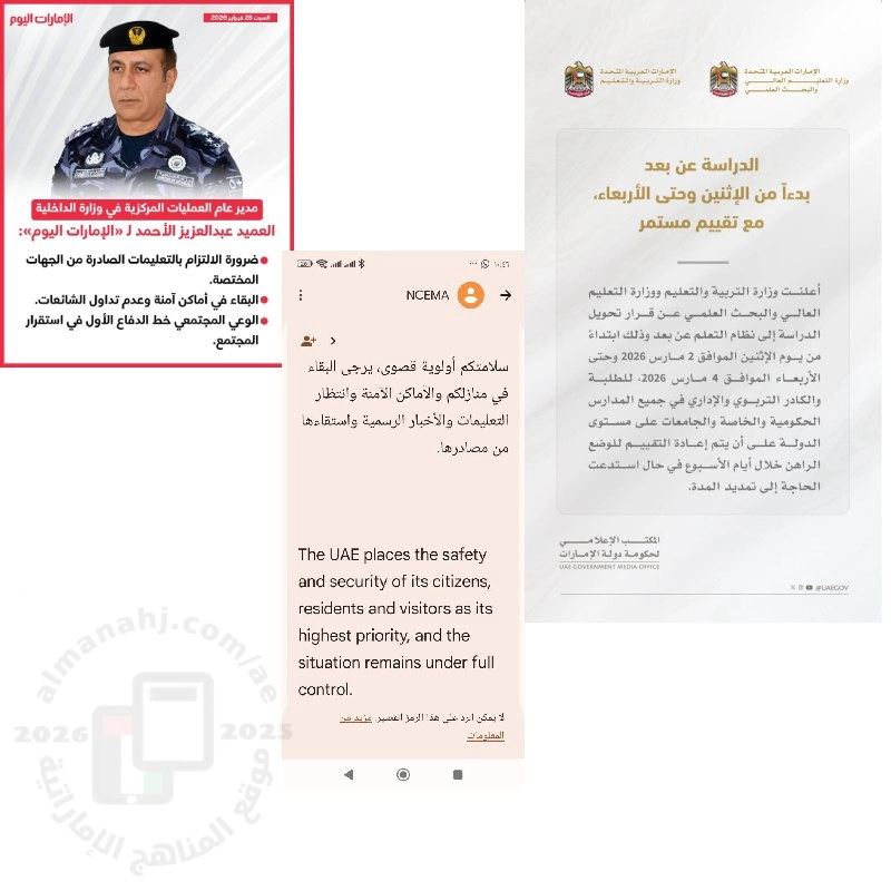 | شهدت دولة الإمارات اليوم مجموعة من القرارات والرسائل الرسمية التي ركزت بشكل مباشر على سلامة الطلبة واستقرار العملية التعليمية، في ظل المستجدات الراهنة. وفي السياق ذاته، أكدت الهيئة الوطنية لإدارة الطوارئ والأزمات والكوارث أن أمن وسلامة المواطنين والمقيمين والزوار يمثل أولوية قصوى، مشددة على أن الأوضاع مستقرة ومستتبة، وأن الجهات المختصة تعمل ضمن منظومة وطنية متكاملة بكفاءة عالية. ومن جانبها، أهابت وزارة الداخلية بالجمهور عدم استخدام خط الطوارئ 999 إلا في الحالات الطارئة الفعلية، بما يضمن سرعة الاستجابة للحالات التي تستدعي تدخلاً عاجلاً. وفي إطار حماية المجتمع من البلبلة والمعلومات المضللة، حذرت النيابة العامة للدولة من نشر أو تداول الشائعات والأخبار الكاذبة أو مجهولة المصدر عبر وسائل التواصل الاجتماعي أو أي وسيلة تقنية معلومات، مؤكدة ضرورة الاعتماد على المصادر الرسمية فقط. وبالنسبة للطلبة وأولياء الأمور، فإن الصورة الرسمية حتى الآن أصبحت أوضح: سلامة الطلبة تتقدم على كل اعتبار، والدوام الدراسي خلال الأيام المحددة سيكون عن بُعد، فيما تبقى متابعة القنوات الرسمية هي المرجع الوحيد لأي تحديث جديد. | ||