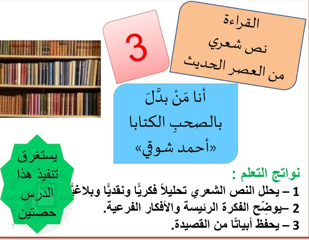 | اضغط هنا لتحميل وعرض ( عرض بوربوينت القراءة نص شعري : أنا من بدل بالصحب الكتابا ) | |||