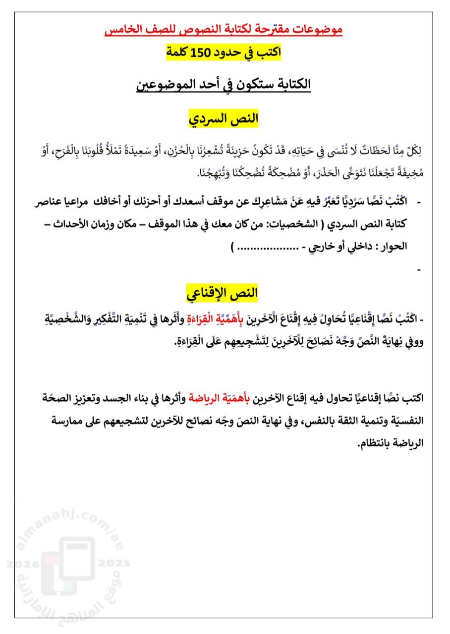 معلومات الملف: موضوعات مقترحة لكتابة النصوص السردية و النصوص الإقناعية يكتب الطالب نص سردي يذكر فيه الشخصيات و مكان و زمان الأحداث و الحوار | ||