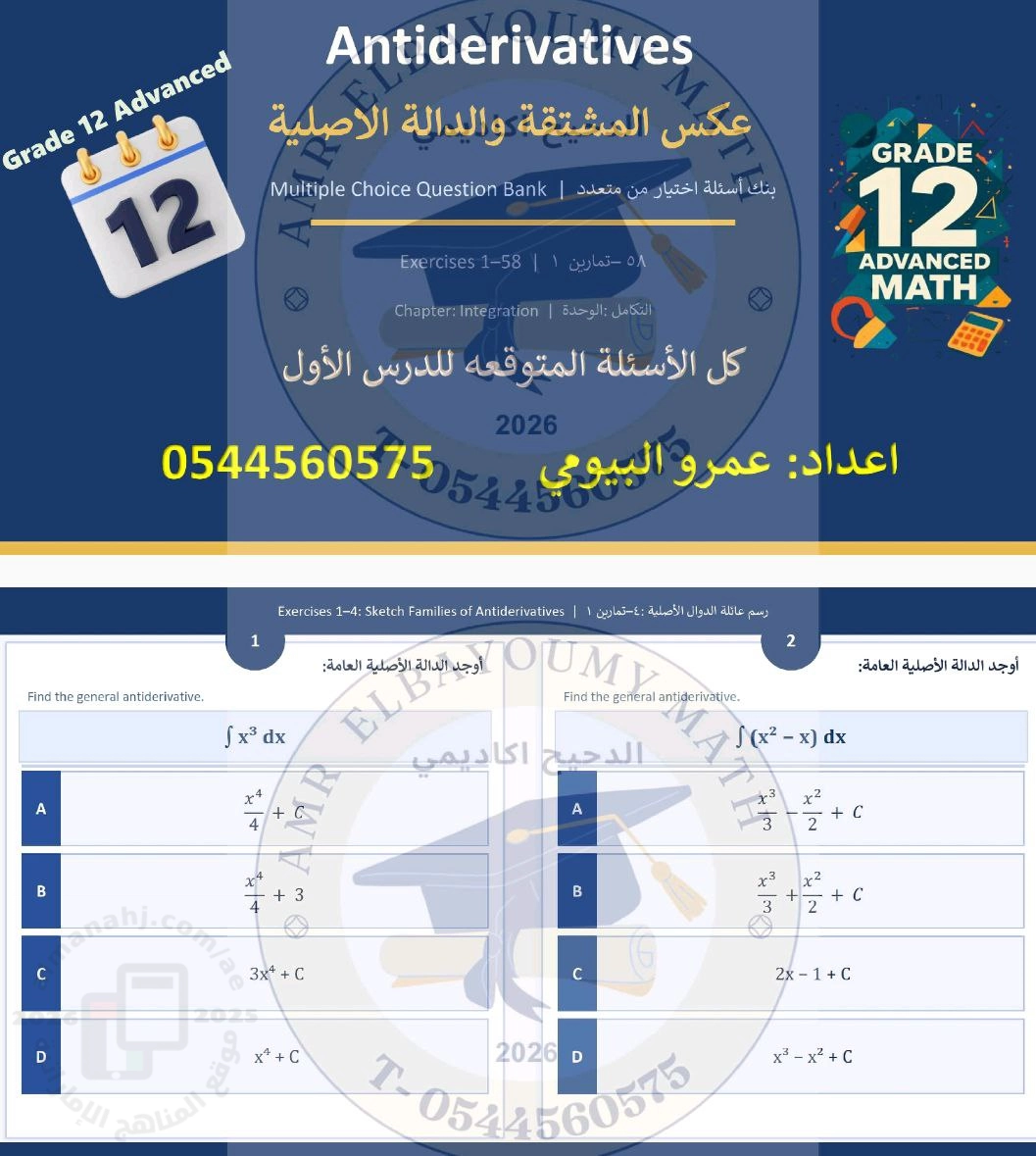 | بنك أسئلة متوقعة الدرس الأول عكس المشتقة والدالة الأصلية من الوحدة الخامسة التكامل - إعداد: عمرو البيومي | ||