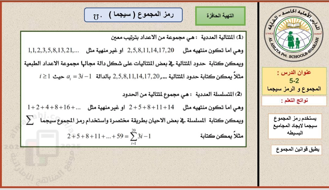 | عرض بوربوينت الدرس الثاني المجموع ورمز سيجما من وحدة التكامل - إعداد: المدارس الأهلية الخاصة | ||