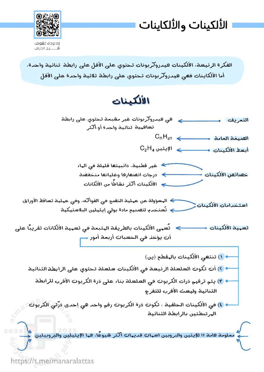 | ملخص الدرس الثالث الألكينات والألكاينات من وحدة الهيدروكربونات - إعداد: منار العطاس | ||