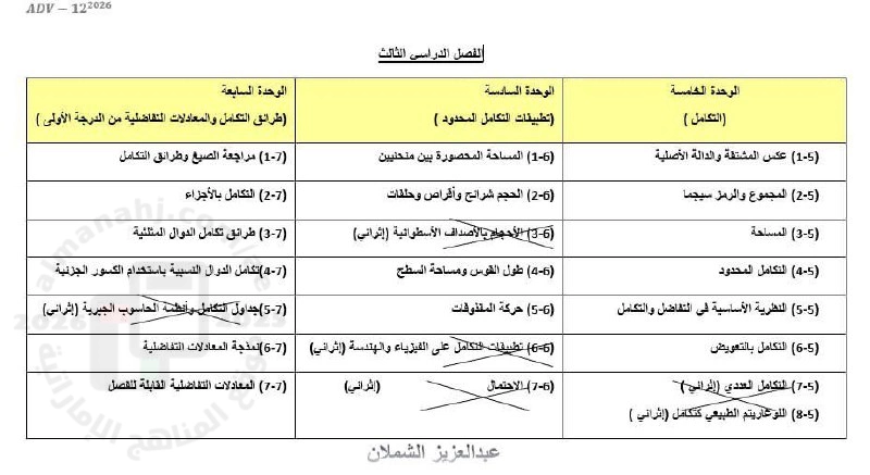 معلومات الملف: مقرر الوحدات و الدروس المطلوبة للفصل الثالث و تشمل ما يلي : الوحدة الخامسة : التكامل ( الدروس 1+2+3+4+5+6) | ||