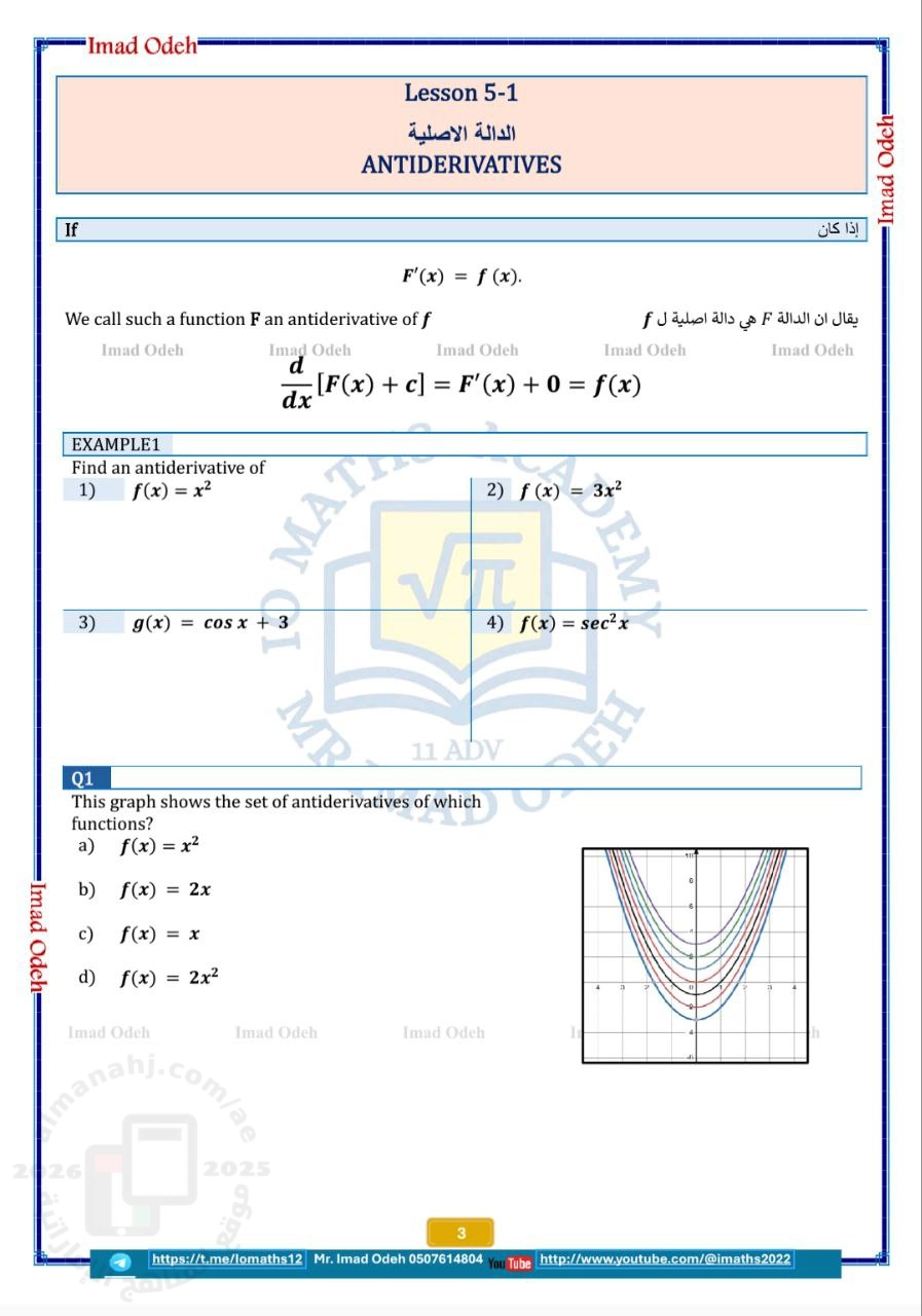 | ملزمة أوراق عمل الوحدة الخامسة Integration التكامل مع أسئلة امتحانات سابقة - إعداد: عماد عودة | ||