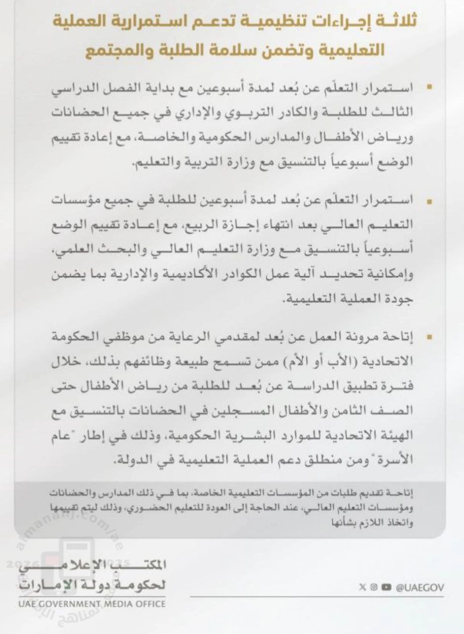 | أعلن مجلس التعليم والتنمية البشرية والمجتمع استمرار تطبيق التعلم عن بُعد لمدة أسبوعين مع بداية الفصل الدراسي الثالث في المدارس ومؤسسات التعليم العالي، إلى جانب إتاحة مرونة العمل لموظفي الحكومة الاتحادية (الأب أو الأم)، ضمن ثلاثة إجراءات تنظيمية تهدف إلى ضمان استمرارية العملية التعليمية وسلامة الطلبة والمجتمع | ||