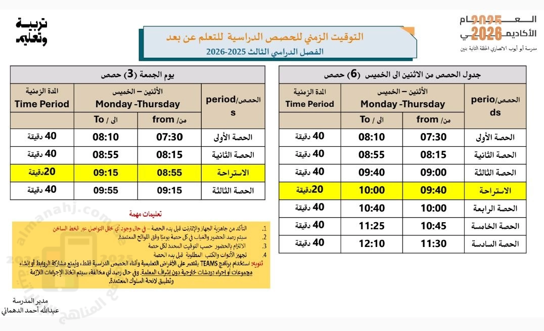 | التوقيت الزمني للحصص الدراسية للتعلم عن بعد في مدرسة أبو أيوب الأنصاري - إعداد: مدرسة أبو أيوب الأنصاري | ||