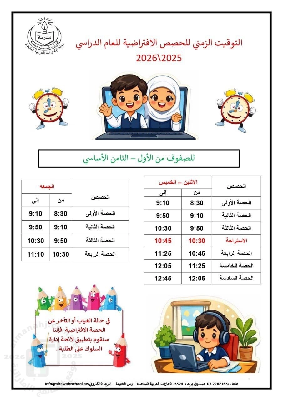 معلومات الملف: تحية طيبة وبعد، نود إبلاغكم بتوقيت الحصص الدراسية (عن بُعد) خلال الاسبوعين القادمين ان شاءالله ، وذلك على النحو التالي: 1) المرحلة الأساسية (من الإثنين إلى الخميس): 2) يوم الجمعة (المرحلة الأساسية): 3) مرحلة رياض الأطفال: كما نؤكد على أهمية متابعة أبنائكم أثناء الحصص الدراسية (عن بُعد)، لما لذلك من دور كبير في تعزيز تحصيلهم الدراسي والتزامهم بالحضور والمشاركة الفاعلة. علماً بأنه سيتم تزويدكم قريباً بالجداول الزمنية التفصيلية لكل مرحلة دراسية بإذن الله. شاكرين تعاونكم ودعمكم المستمر، | ||