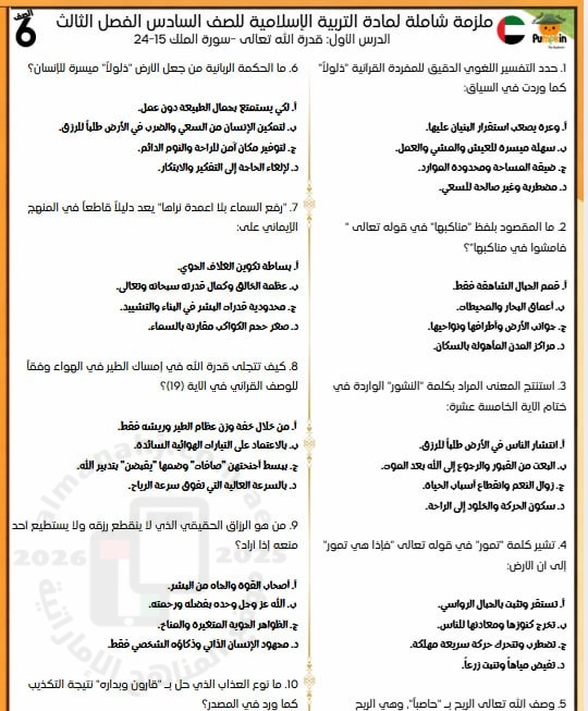 معلومات الملف: يحتوي هذا الملف على ملزمة تعليمية لمادة التربية الإسلامية للصف السادس (الفصل الثالث – الوحدة الخامسة)، ويحتوي على ملخصات مبسطة للدروس وشرح لأفكار ومفاهيم دينية بطريقة سهلة، مع أمثلة توضيحية تساعد على الفهم، بالإضافة إلى أسئلة اختيار من متعدد مع الإجابات وأنشطة للمراجعة والتدريب، بهدف تسهيل الدراسة والاستعداد للاختبارات. | ||