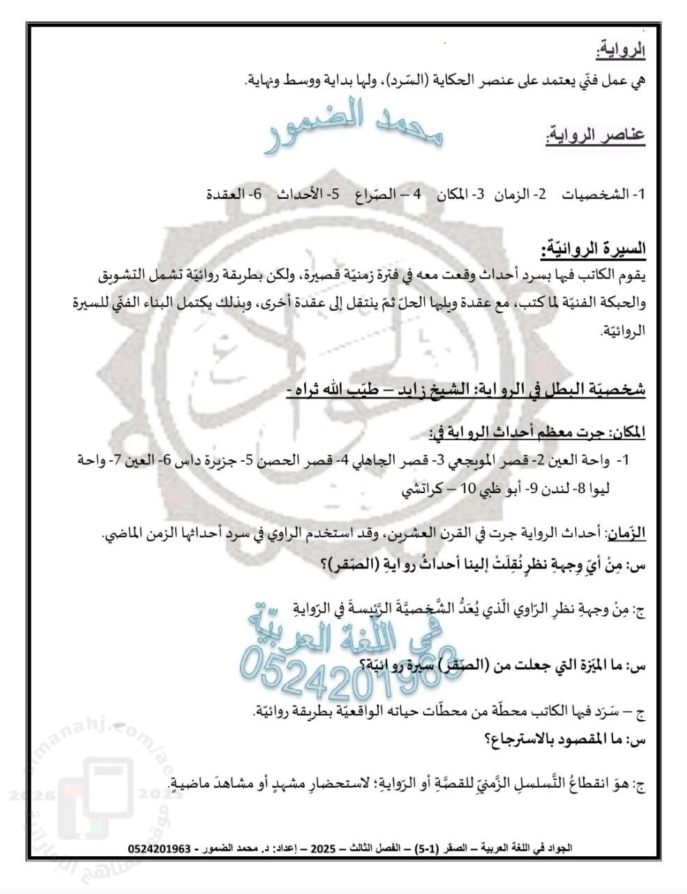 | ملخص وإجابات أسئلة الفصول الخمسة الأولى من رواية الصقر - إعداد: محمد الضمور | ||