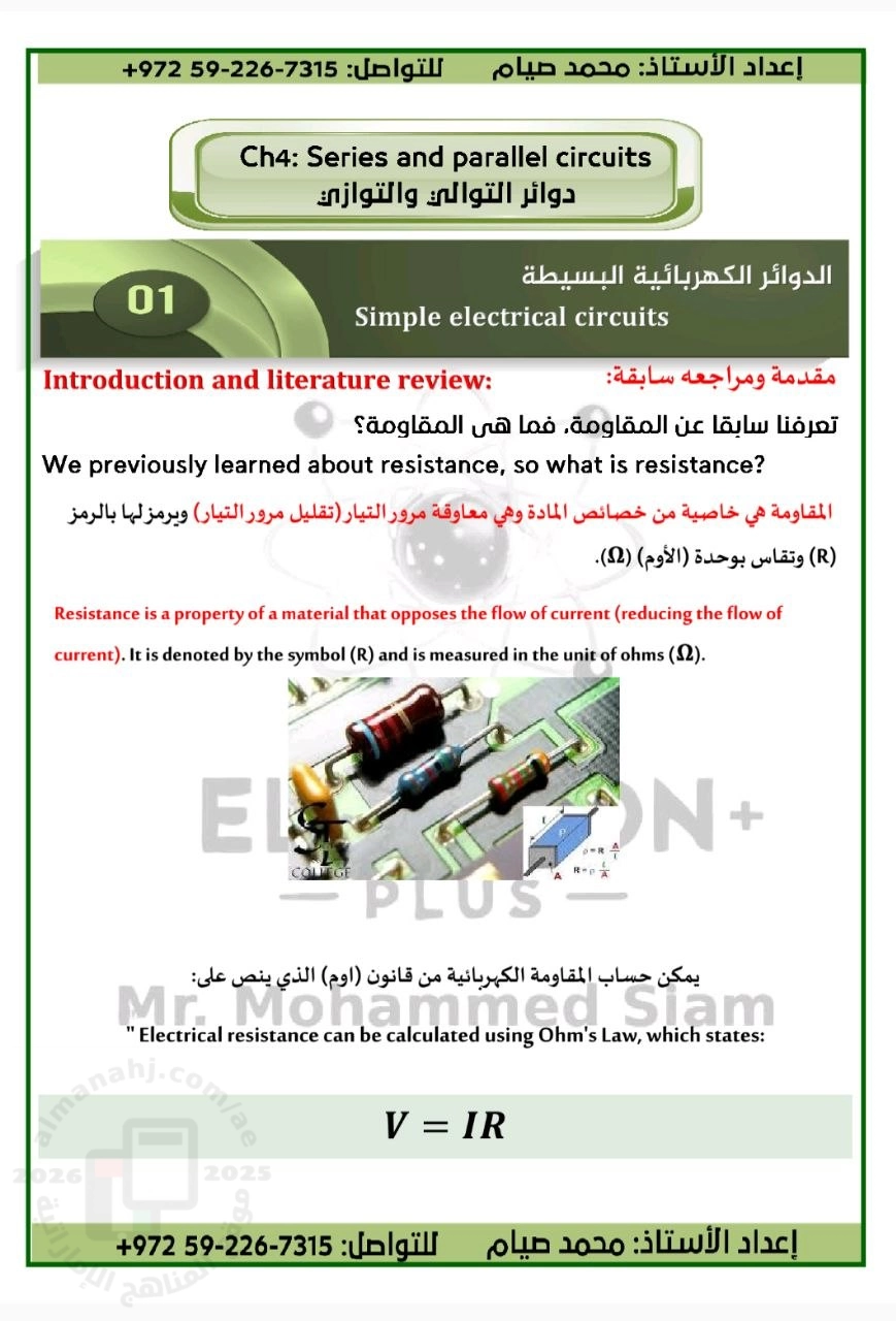 ملزمة الوحدة الرابعة Series and Parallel Circuits دوائر التوالي والتوازي, محمد صيام, الصف الثاني عشر العام, فيزياء, الفصل الثالث, 2025-2026 | ||