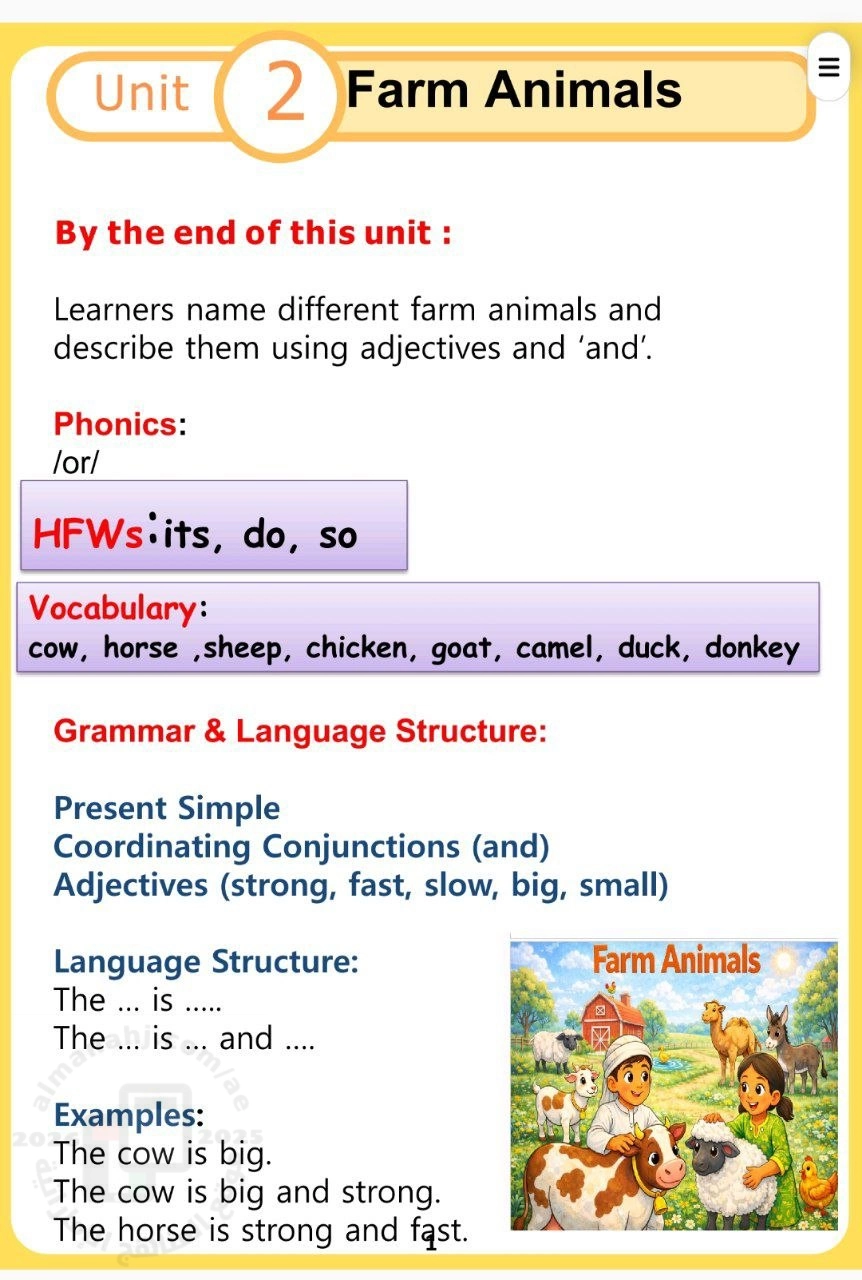 معلومات الملف: ملخص الوحدة الثانية (Unit 2: Farm Animals) الأسبوع الثاني : عنوان الوحدة: Farm Animals أهداف الوحدة: · أن يسمع المتعلم أسماء حيوانات المزرعة. المحتوى الصوتي (Phonics): · صوت /or/ الكلمات البصرية (HFWs): its, do, so المفردات (Vocabulary): cow, horse, sheep, chicken, goat, camel, duck, donkey القواعد والتراكيب اللغوية: · Present Simple الأنشطة في الوحدة (أمثلة): 1. Match pictures with words. قواعد الكتابة: · ابدأ الجملة بحرف كبير. | ||
