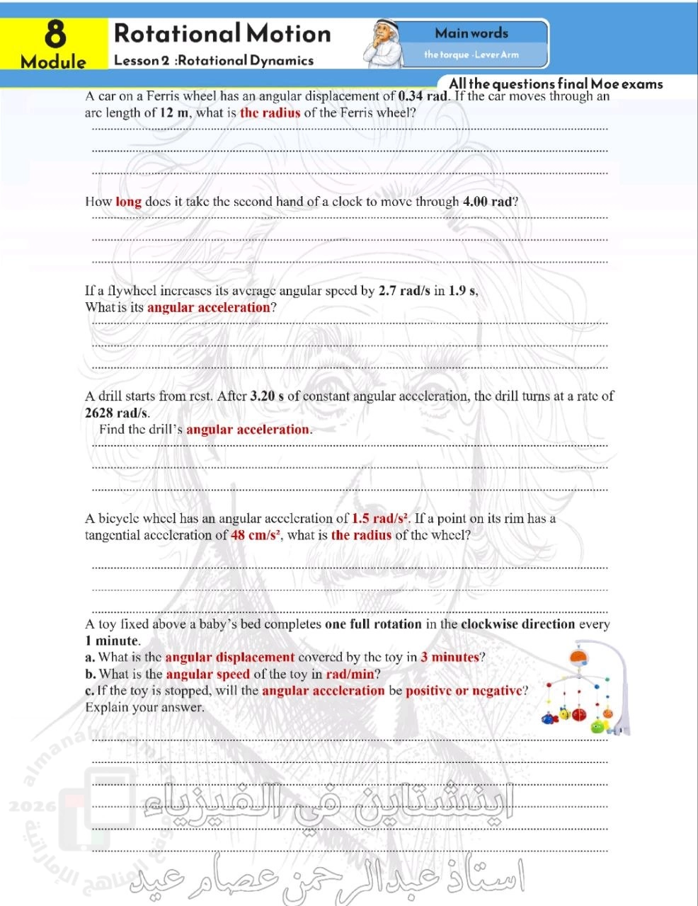 2. الصف الحادي عشر المتقدم, فيزياء, أوراق عمل الدرس الثاني Rotational Dynamics من الوحدة الثامنة Rotational Motion منهج انسباير