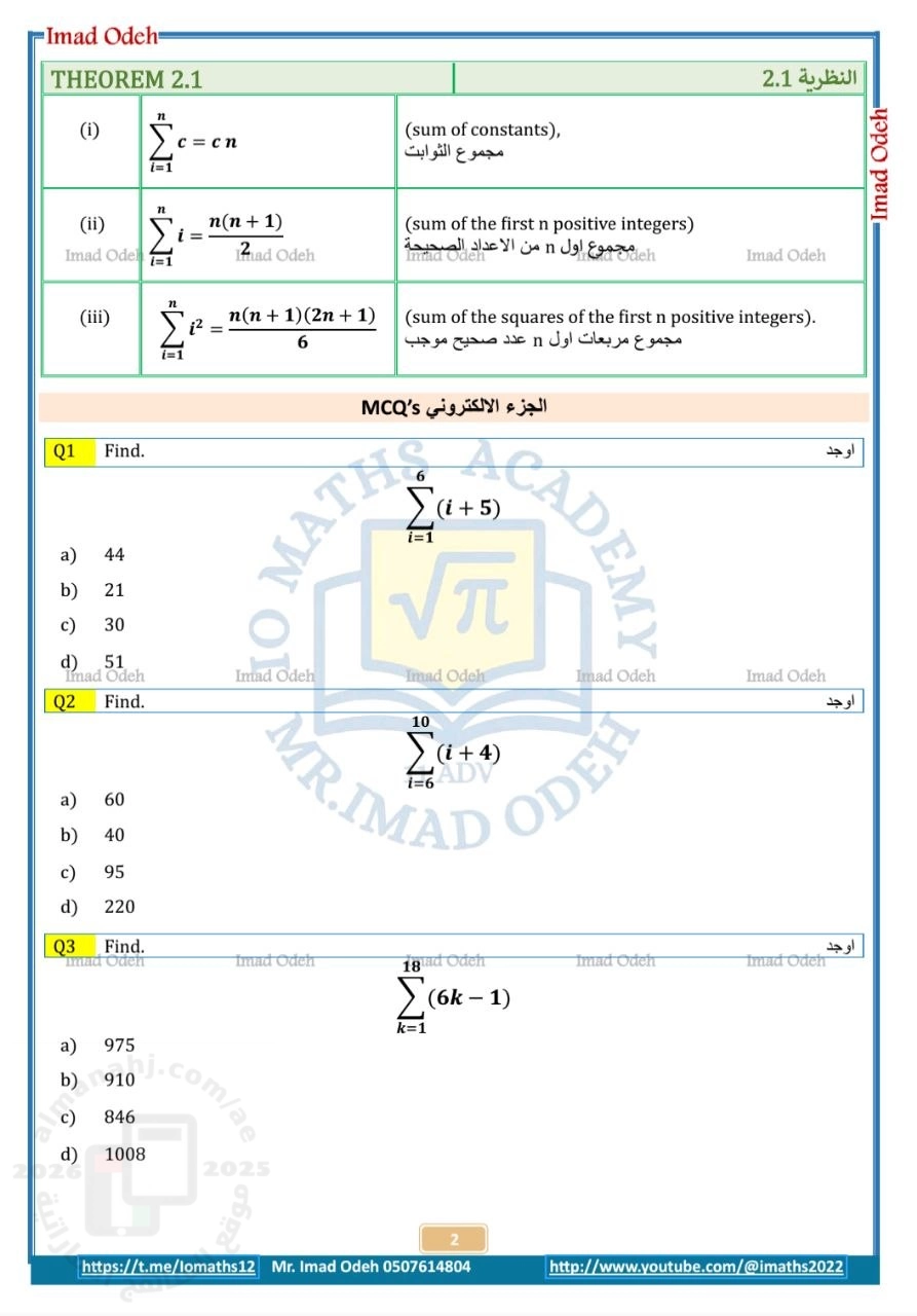 | مراجعة الدرس الثاني المجموع ورمز المجموع من الوحدة الخامسة التكامل اعتماداً على الاختبارات السابقة (اختبر نفسك 2) - إعداد: عماد عودة | ||
