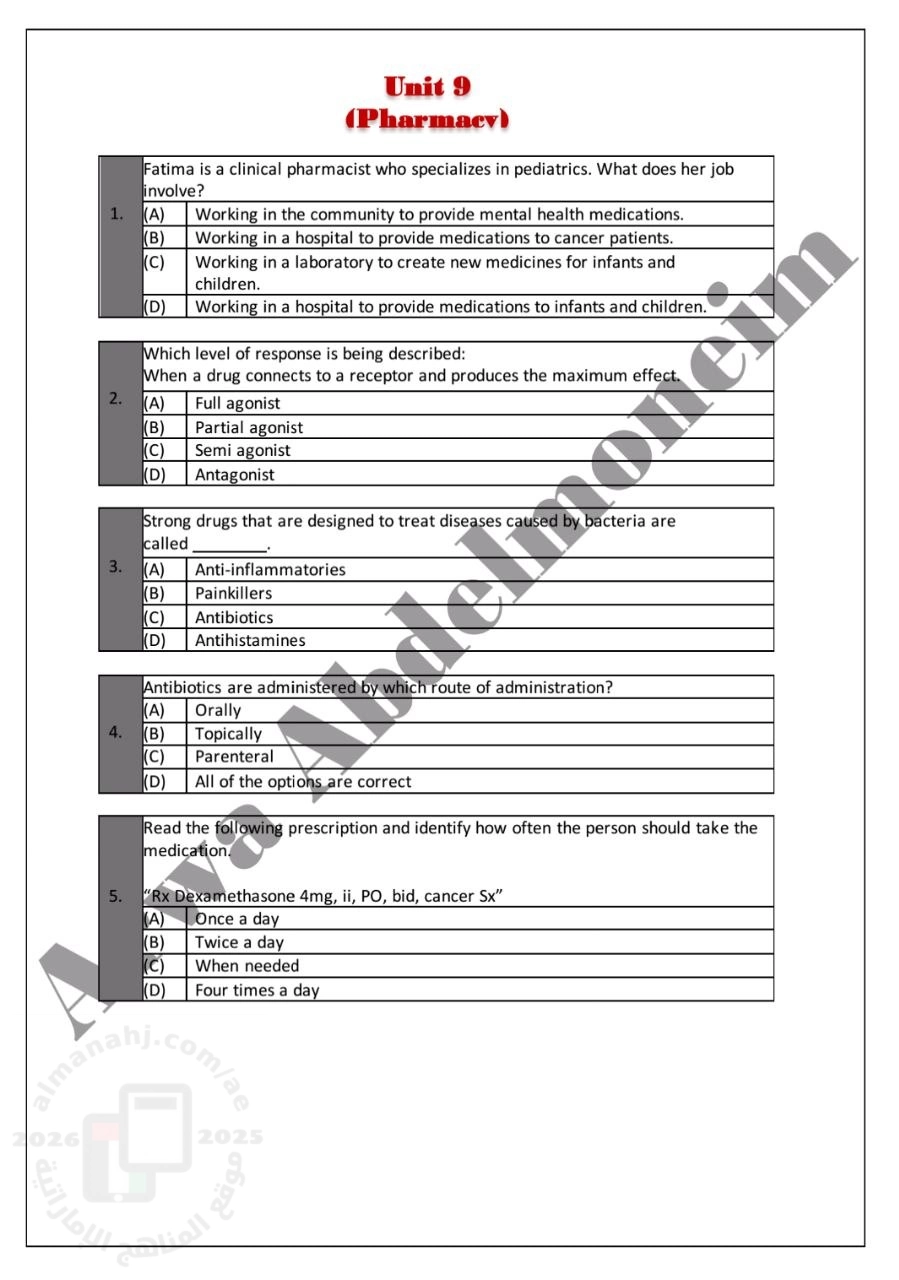 معلومات الملف: أوراق عمل اختيار من متعدد الوحدة التاسعة Pharmacy الصيدلية بدون الحل | ||