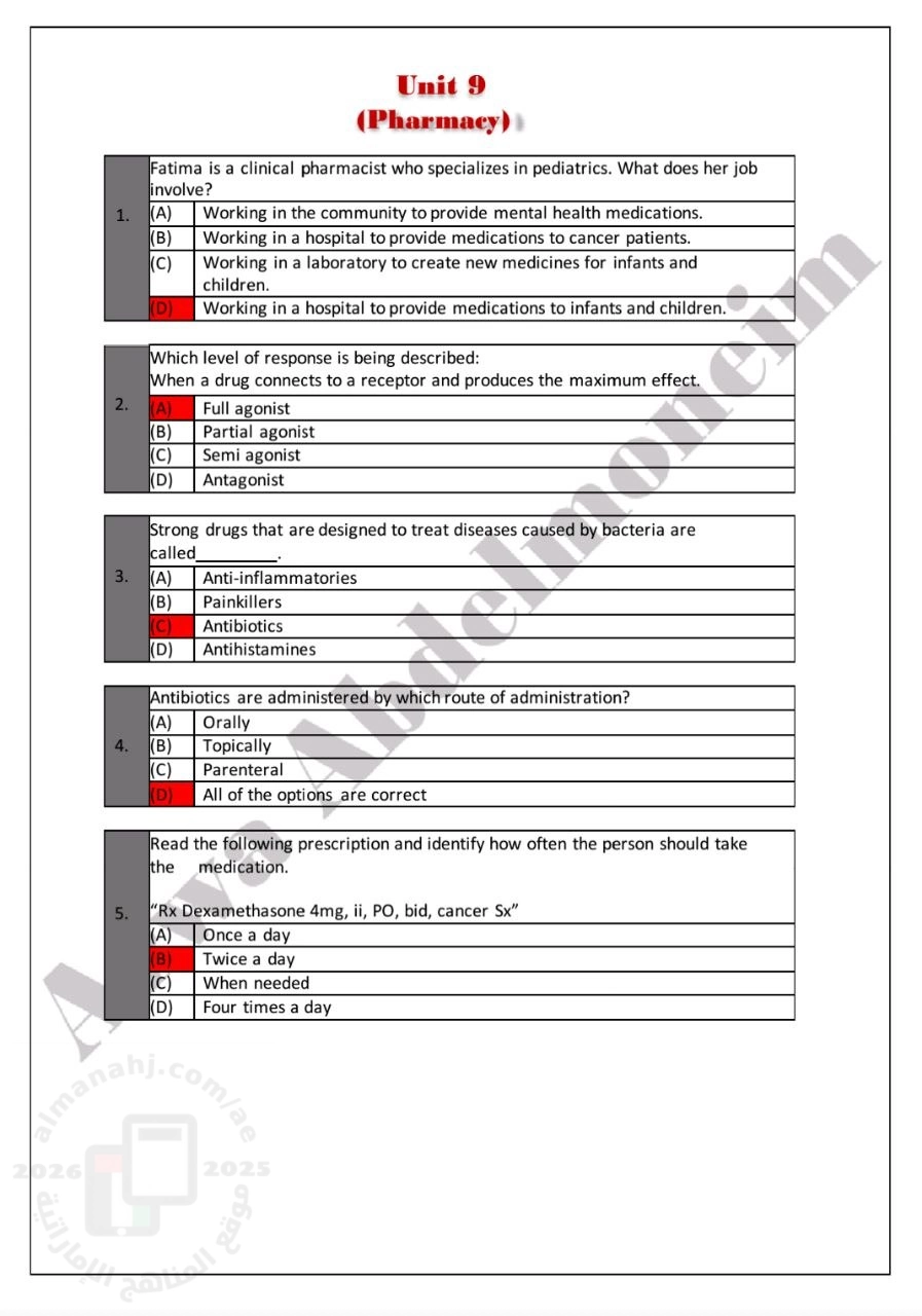 معلومات الملف: أوراق عمل اختيار من متعدد الوحدة التاسعة Pharmacy الصيدلية مع الحل | ||