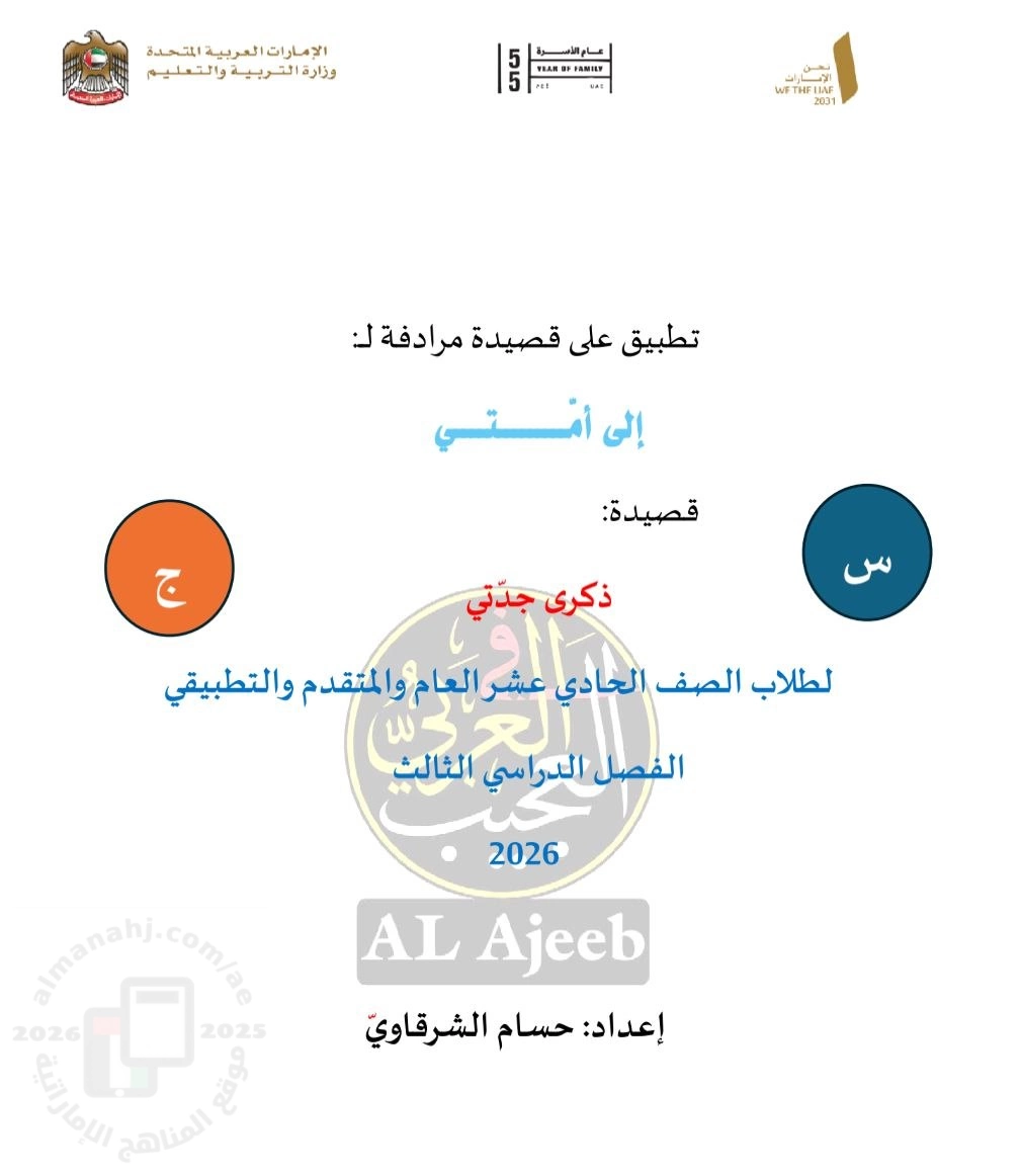 معلومات الملف: تطبيق على قصيدة ذكريات جدتي مرادفة لقصيدة إلى أمتي متبوع بالإجابات النموذجية الشاعر: جمال بن حويرب (إماراتي) تطور الفكرة: العاطفة السائدة: الحزن والحنين. · «يد الأيام»: استعارة مكنية توحي بتغير الزمان وزوال الجمال. رسالة القصيدة: | ||