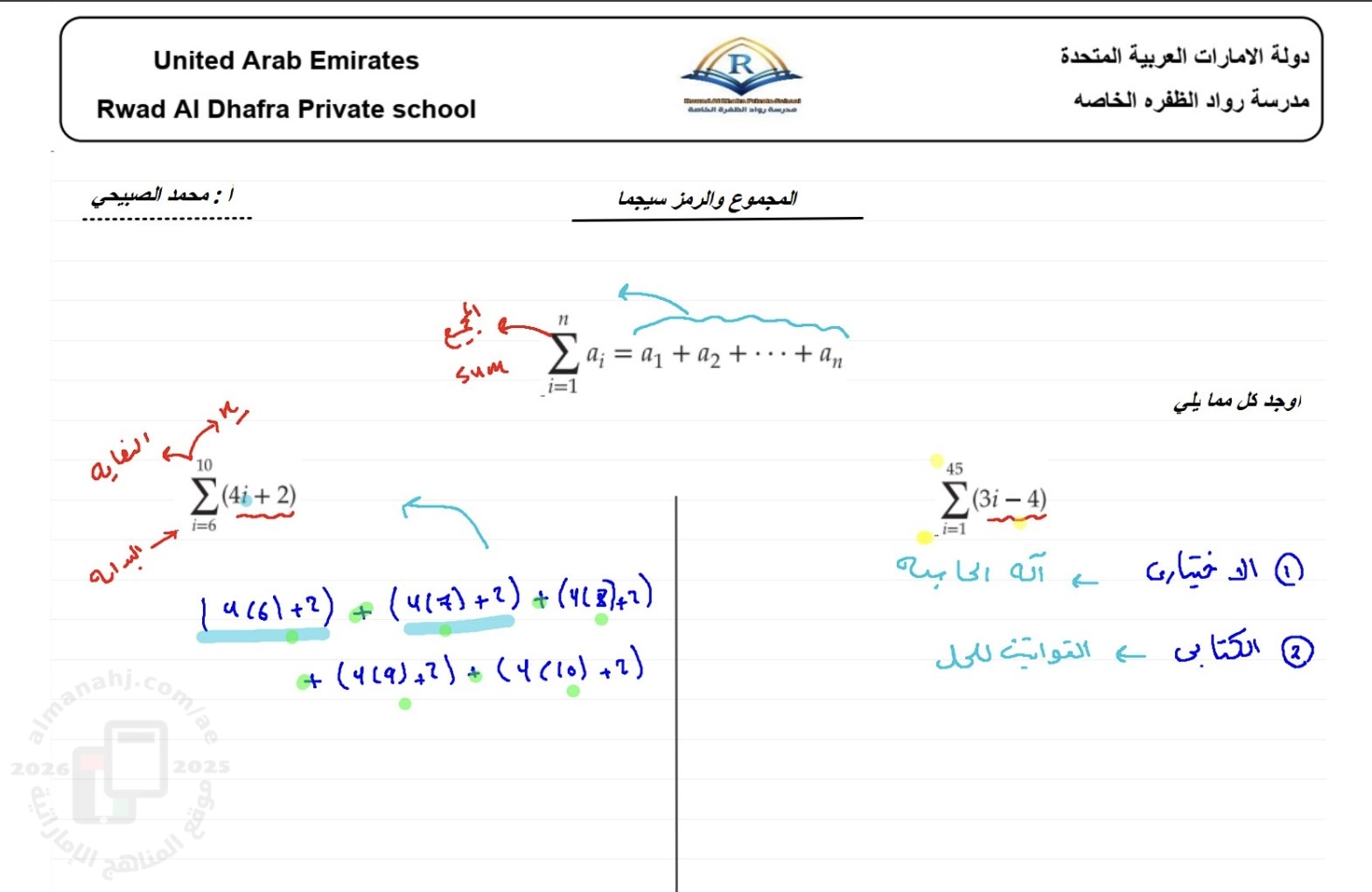 حل تدريبات متنوعة حول المجموع والرمز سيجما 2026, محمد الصبيحي, الصف التاسع المتقدم, رياضيات, الفصل الثالث, 2025-2026 | ||