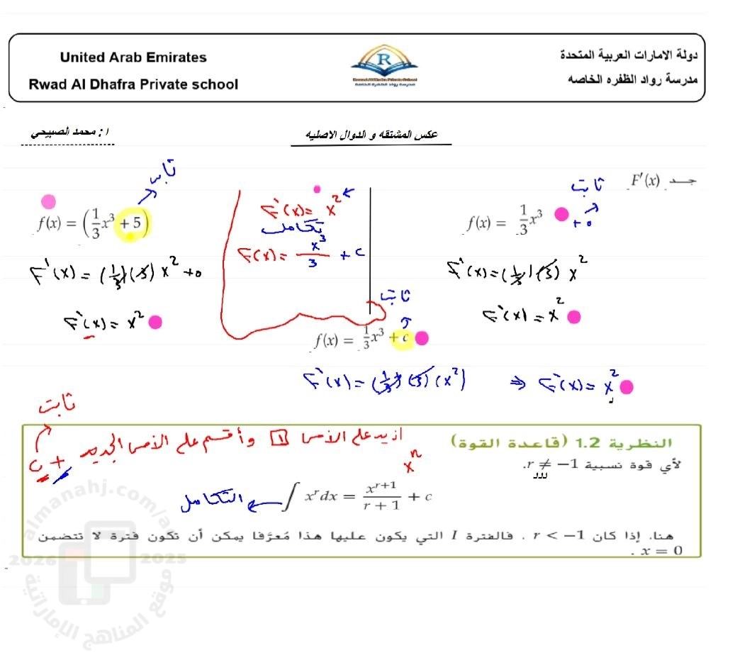 حل تدريبات درس عكس المشتقة والدوال الأصلية القسم الثاني, محمد الصبيحي, الصف الثاني عشر المتقدم, رياضيات, الفصل الثالث, 2025-2026 | ||