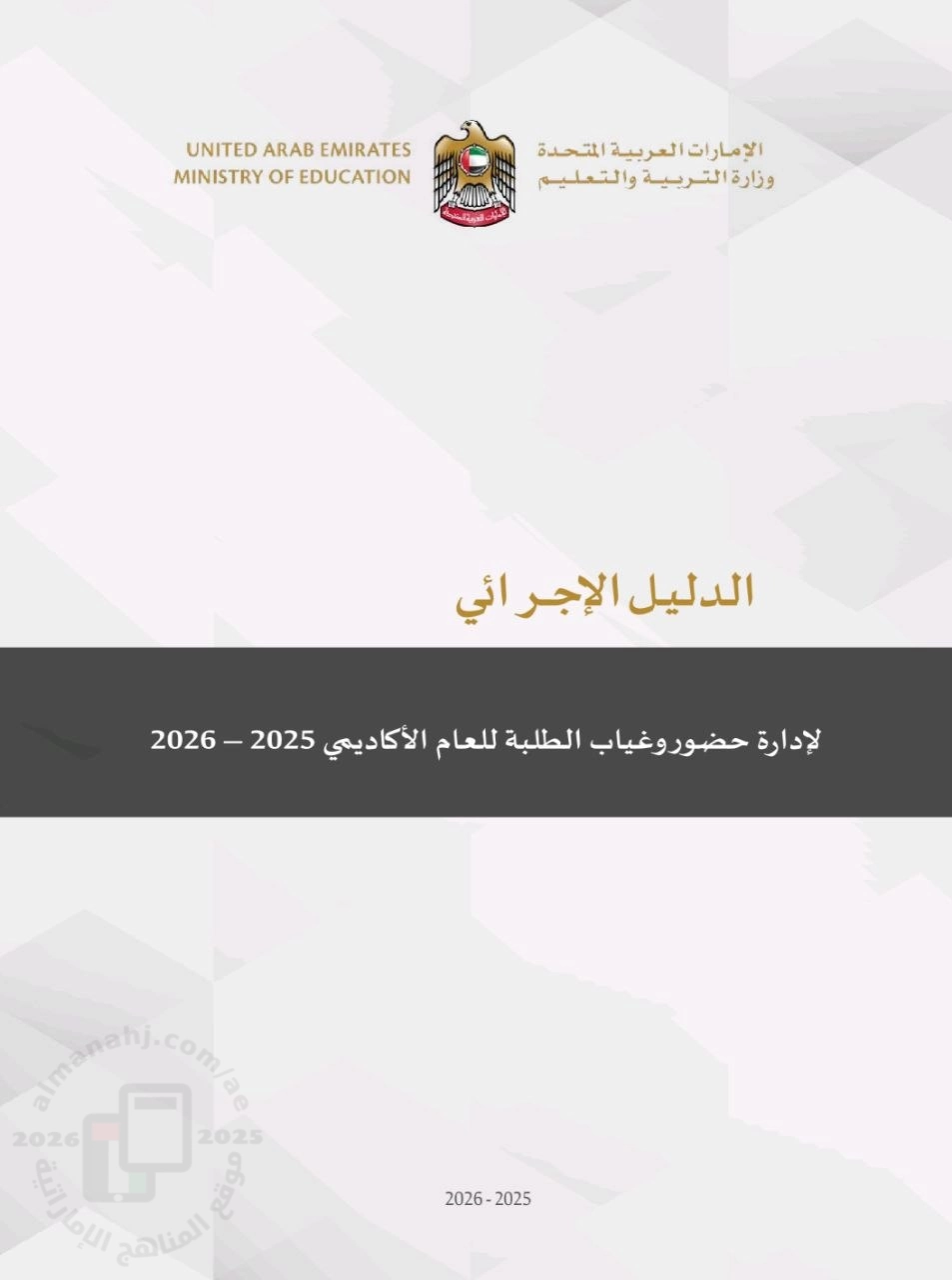 معلومات الملف: الدليل الإجرائي لإدارة حضور وغياب الطلبة للعام الأكاديمي 2025-2026 يهدف هذا الدليل الإجرائي إلى تنظيم وتوضيح الأدوار والمسؤوليات والمهام المترتبة على مختلف الجهات التربوية، بما يضمن التطبيق الفعّال لإجراءات الحضور و الغياب للطلبة، ومتابعة تنفيذها على مستوى المدرسة والنطاق والوحدات التنظيمية المختصة في الوزارة، ويستند هذا الدليل إلى أن الانتظام في الحضور المدرسي يُعد متطلبًا جوهريًا يؤثر بصورة مباشرة في مستوى تحصيل الطالب الأكاديمي. يُطْبّق نظام تفصيلي لاحتساب الحضور والغياب يرتبط ارتباطًا وثيقًا بمعايير النجاح والرسوب، وقد تم اعتماد الحد الأقصى للغياب غير المبرر/الغياب بدون عذر مقبول بخمسة عشر (15) يومًا خلال العام الدراسي. | ||