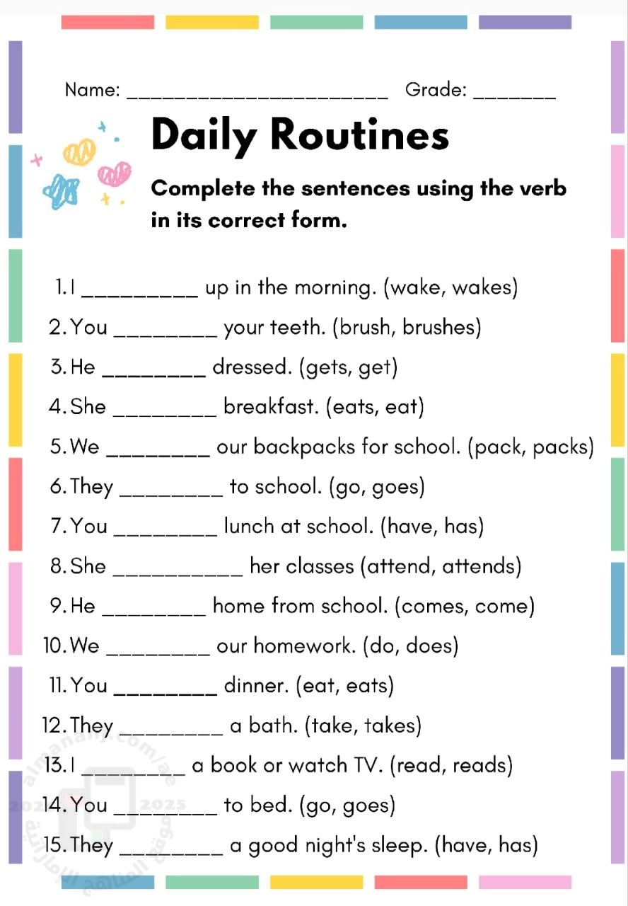 معلومات الملف: تمارين وأنشطة وحدة My Daily Routine الروتين اليومي الأسبوع الثاني هذا الملف عبارة عن مجموعة أوراق عمل تعليمية لتعليم "الروتين اليومي" (Daily Routines) باللغة الإنجليزية، موجهة لطلاب ااصف الثالث. 1. تمارين اختيار الفعل الصحيح (مثل: wake/wakes، brush/brushes) لإكمال جمل عن أنشطة يومية. | ||