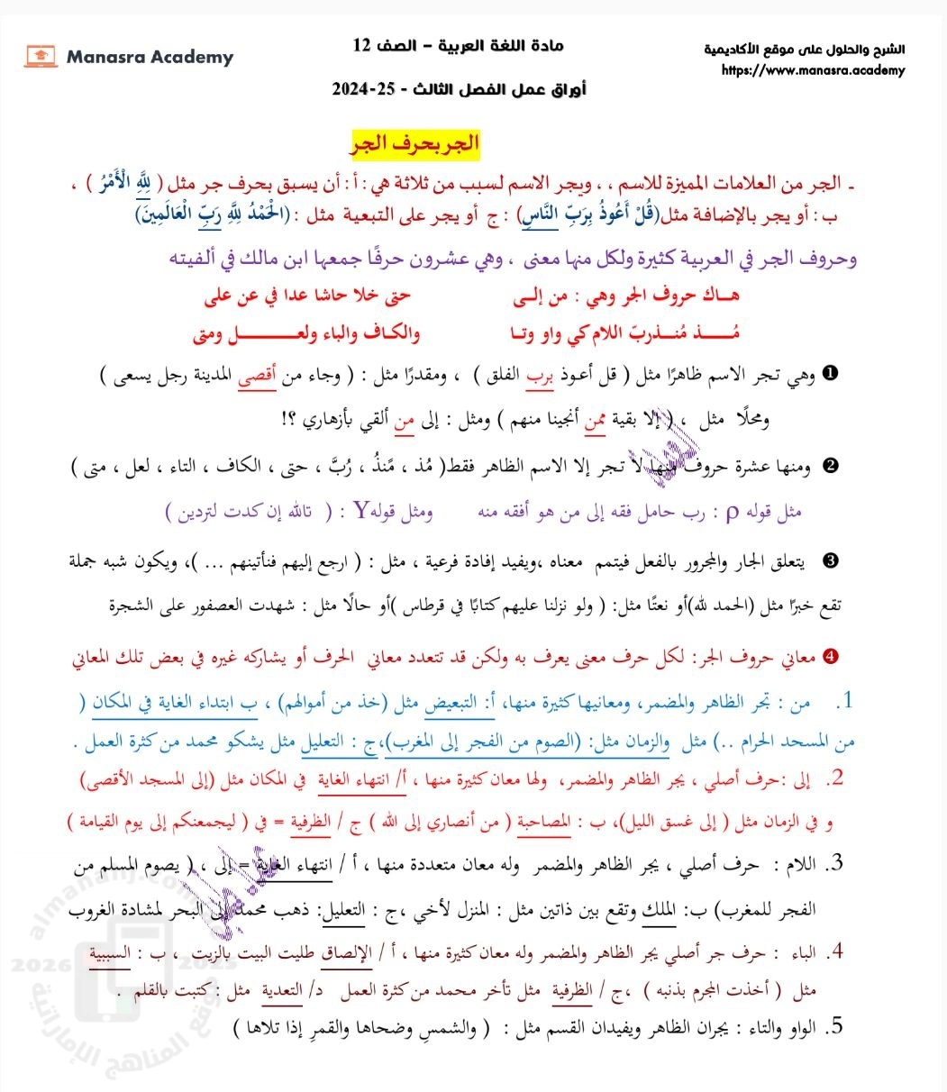 معلومات الملف: تلخيص مذكرة اللغة العربية (النحو والأدب) – الصف 12، الفصل الثالث 2024-2025 إعداد: الأستاذ عماد طبل (العمدة) أولاً: الإضافة (التركيب الإضافي) · تعريف: تركيب من اسمين، الثاني (المضاف إليه) يجر الأول (المضاف). · معاني الحروف: شرح دلالات بعض الحروف مثل: ثالثاً: التوابع 1. النعت (الصفة): القسم الثاني: الأدب (تحليل نصوص) 1. قصيدة "يا ليل لا تعتب عليّ": 1. قصة "طفل وكلب ذات ليل" (أماليا رانديك): ثالثاً: تحليل نصوص نثرية أخرى (مثل "همّ في الطريق") · الفكرة: التأمل في آلام الآخرين الغريبة والمجهولة في المدينة، والتعاطف مع بائس يخفي فقره ويحلم بمشاريع وهمية. | ||