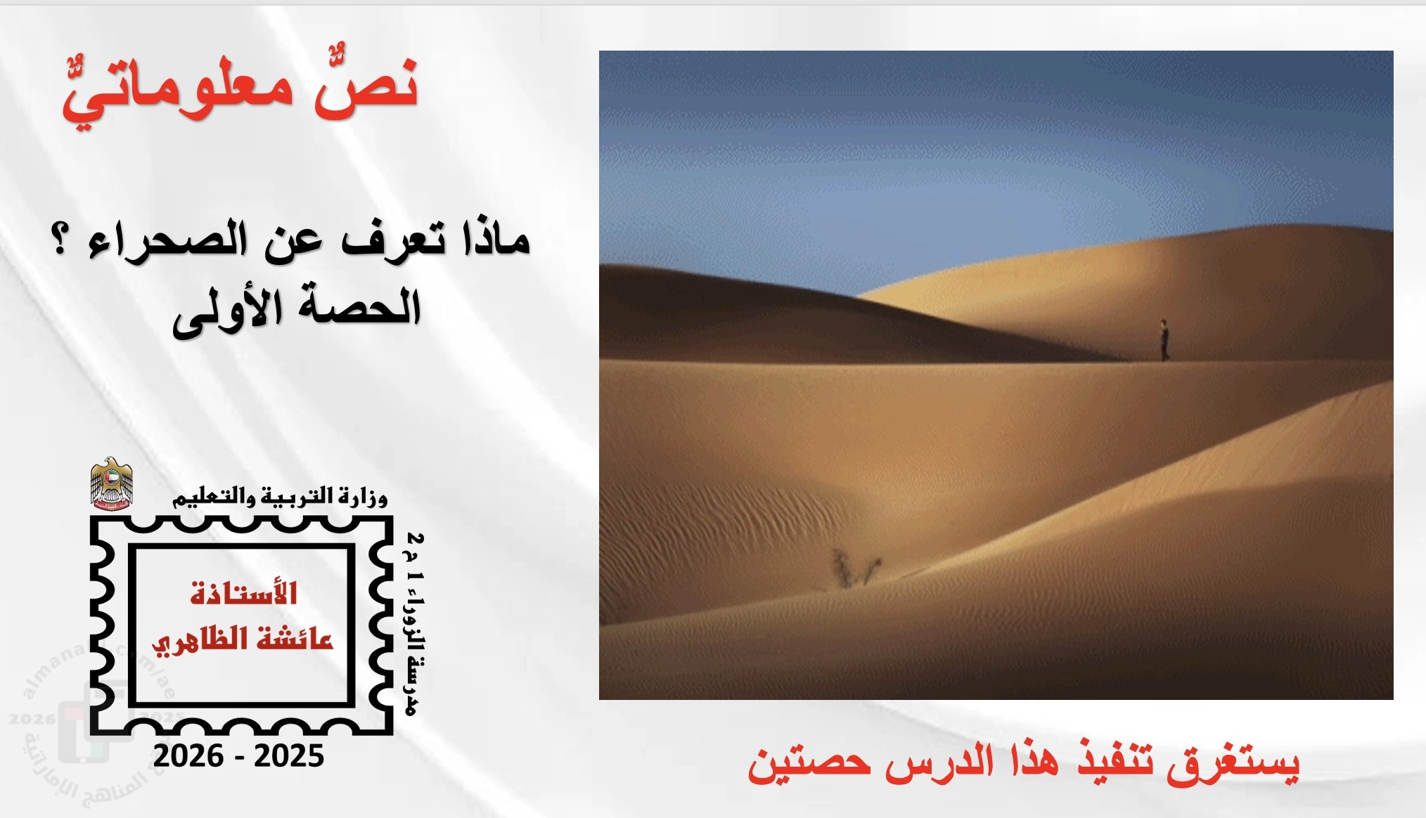 نقدم لكم ملف يتضمن عرض بوربوينت نص معلوماتي درس ماذا تعرف عن الصحراء ? الحصة الأولى