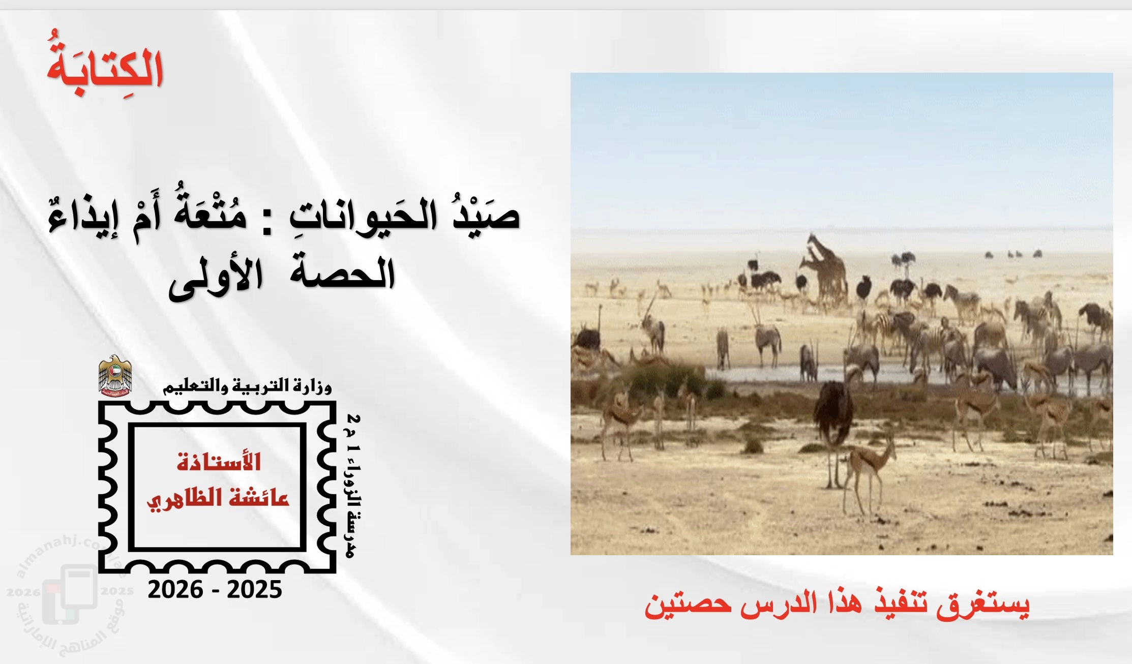 1. لغة عربية, الفصل الثالث, 2025-2026, عرض بوربوينت الكتابة درس صيد الحيوانات: متعة أم إيذاء