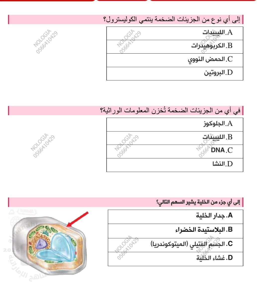 | أسئلة اختبار الوحدة الثامنة بنية الخلية ووظيفتها NOLOGIA | ||