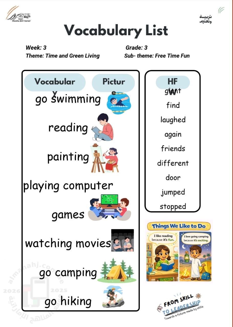 تم إيجاد الملف: قائمة المفردات Vocabulary list درس Free time fun الأسبوع الثالث