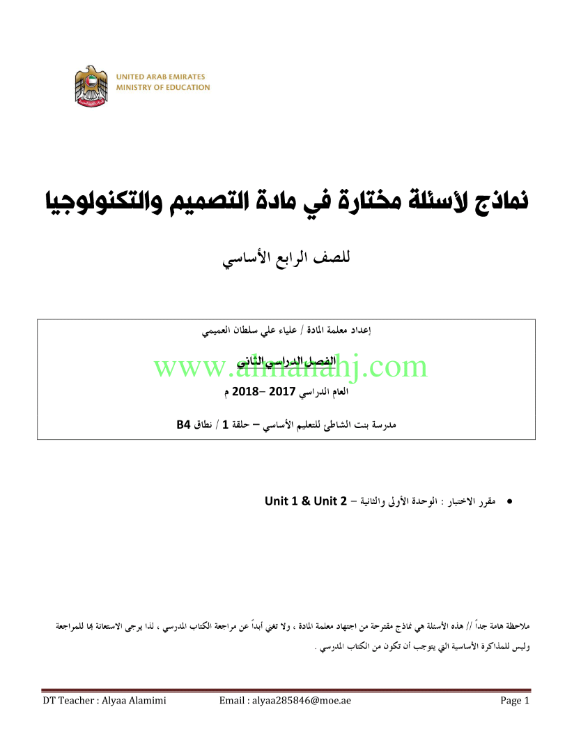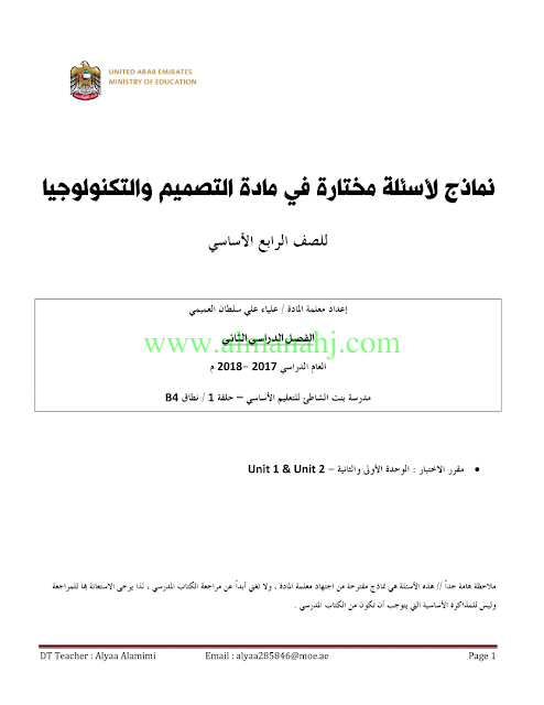 معلومات الملف: الصف الرابع, الفصل الثاني, تصميم وتكنولوجيا, 2017-2018, نماذج لاسئلة مختارة في مادة التصميم والتكنولوجيا | |||