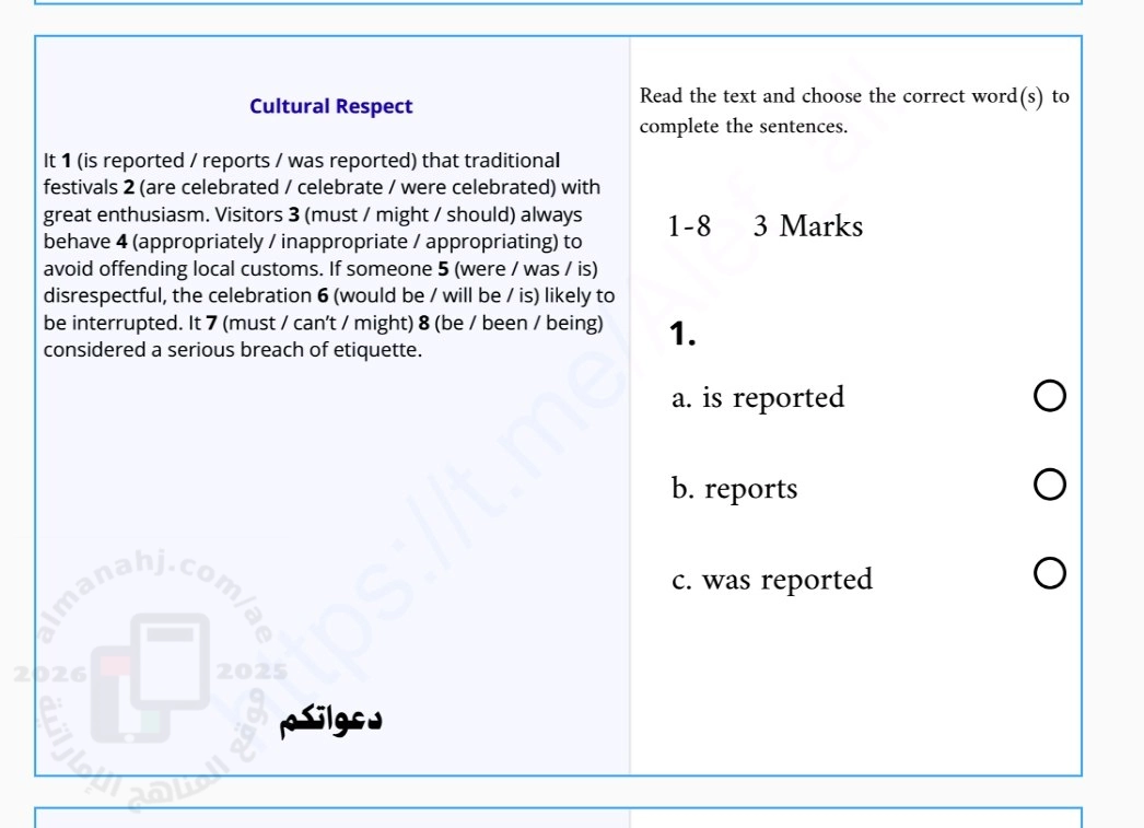 · يحتوي على ثلاثة نصوص رئيسية، كل نص يتبعه 8 أسئلة من نوع الاختيار من متعدد (اختر الإجابة الصحيحة).