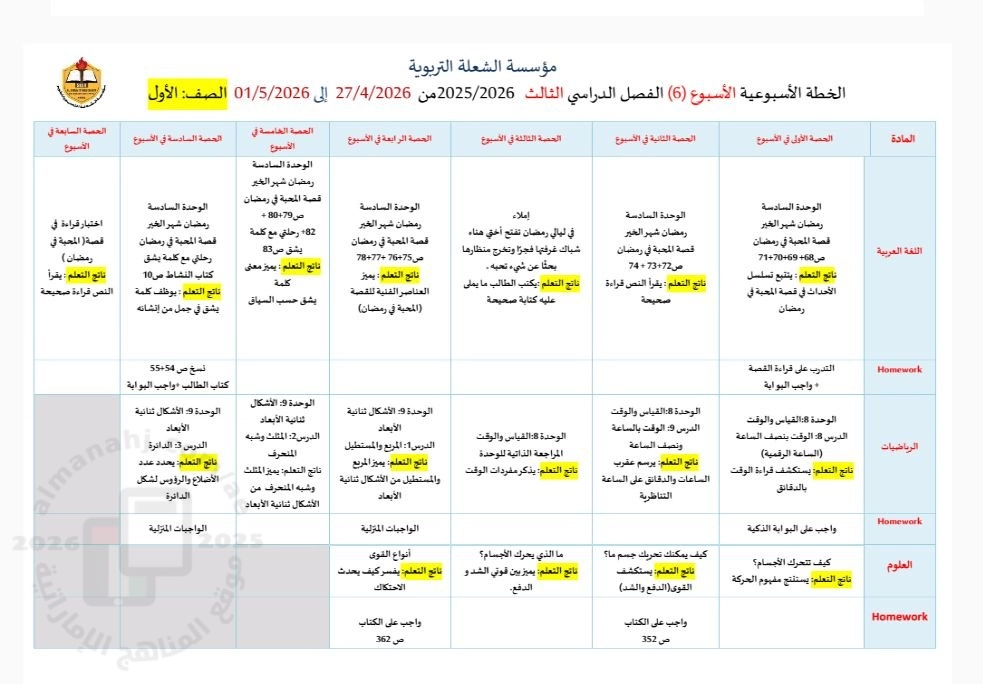 الخطة الأسبوعية الأسبوع الخامس الفصل الثالث جميع الصفوف من مدرسة الشعلة الخاصة