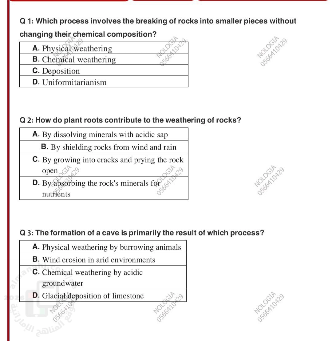 يقيّم هذا الاختبار فهم الطالب لآليات تغير سطح الأرض عبر التجوية (كيميائية بجذور النباتات والمياه الحمضية، وفيزيائية بالحفر)، والتعرية (خارجية المنعطفات في المجاري المائية)، والترسيب (اللوس والكثبان).