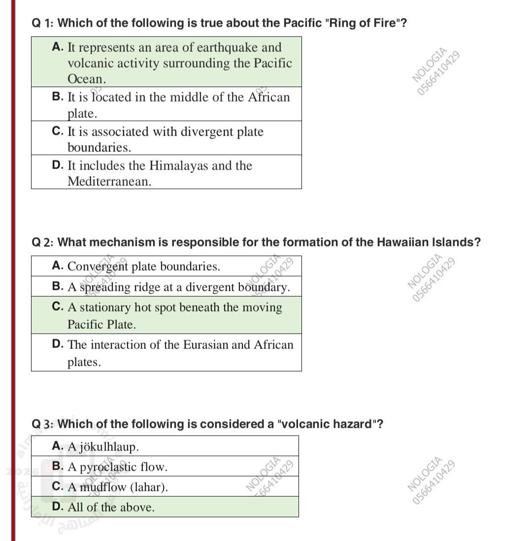 يغطي هذا الاختبار آليات تشكل البراكين كالنقطة الساخنة الثابتة أسفل الصفيحة الهادئة (جزر هاواي)، والمخاطر البركانية كالتدفقات الفتاتية والانهيارات الطينية والفيضانات الجليدية.