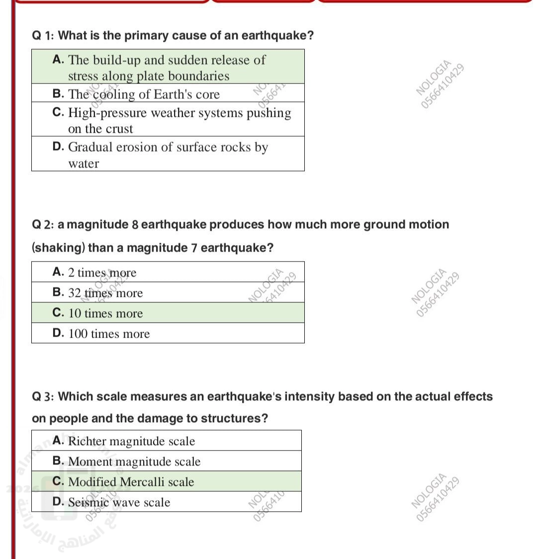 يقيّم هذا الاختبار الفرق بين مقياس الشدة (ميركالي المعدل) وال magnitude (ريختر والعزم الزلزالي)، حيث يبلغ الفرق بين درجة 7 و8 حوالي 32 ضعفًا في الحركة الأرضية.