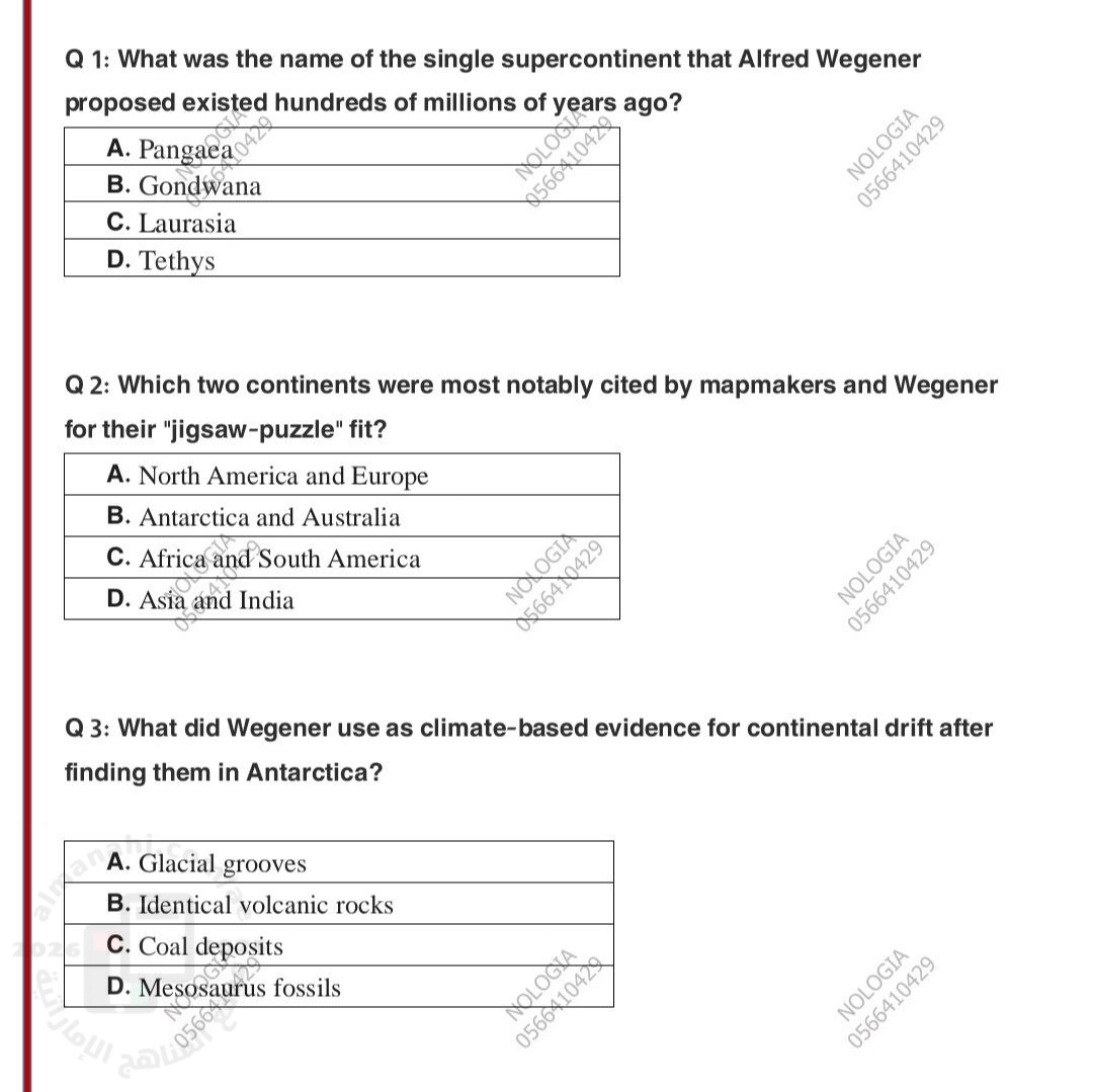يقيّم هذا الاختبار أدلة نظرية الانجراف القاري عند ويجنر، منها تطابق سواحل أفريقيا وأمريكا الجنوبية كقطع البازل، وحفريات الزواحف (الميزوصور) والنباتات (الغلوسوبتيريس) عبر محيطات شاسعة، ووجود أخاديد جليدية في مناطق حارة حالياً.