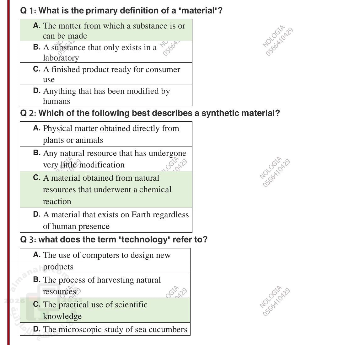 حلول اختبار انسباير التقنية التركيبية بحسب الصف السابع في مادة العلوم – الفصل الثالث