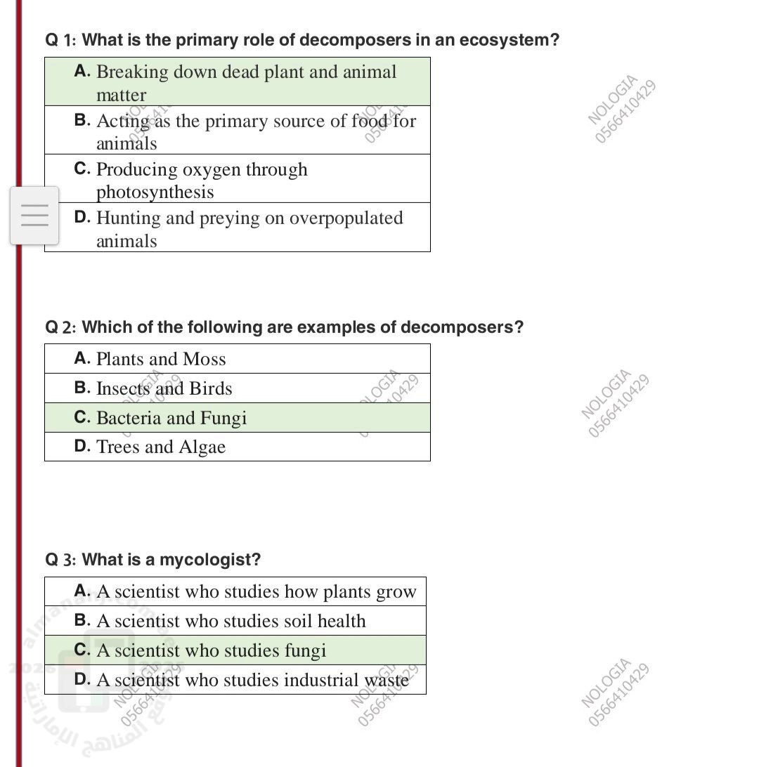 يشرح هذا الاختبار الوظيفة الأساسية للمحللات كتحليل المواد الميتة وإعادة المغذيات للتربة، مع أمثلة على البكتيريا والفطريات.